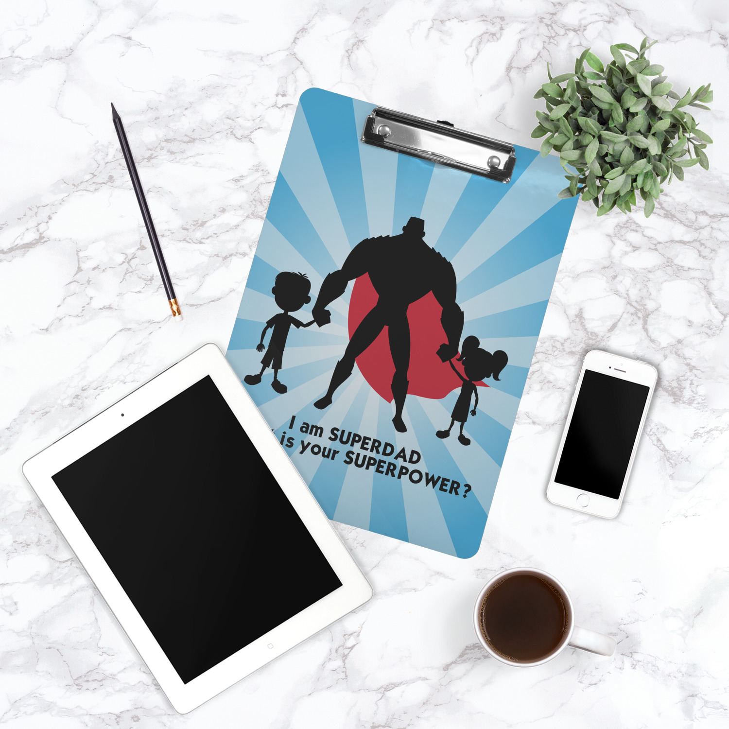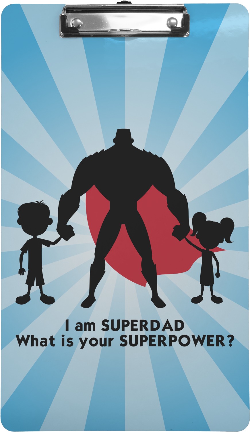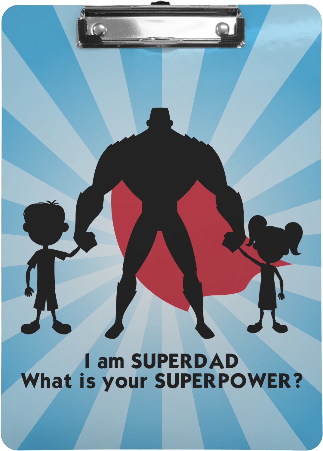 Our dads are our superheroes and this super dad design reflects that. Our design depicts a superhero male holding hands with a little boy and girl. Our super hero dad is wearing a red cape. We used a starburst in blue to really highlight our superhero dad!
