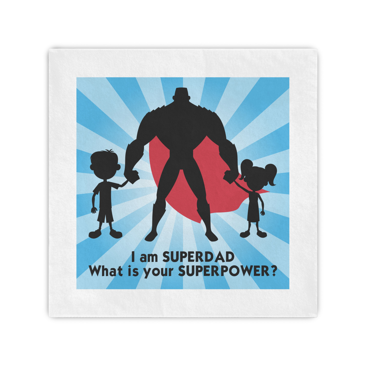 Our dads are our superheroes and this super dad design reflects that. Our design depicts a superhero male holding hands with a little boy and girl. Our super hero dad is wearing a red cape. We used a starburst in blue to really highlight our superhero dad!