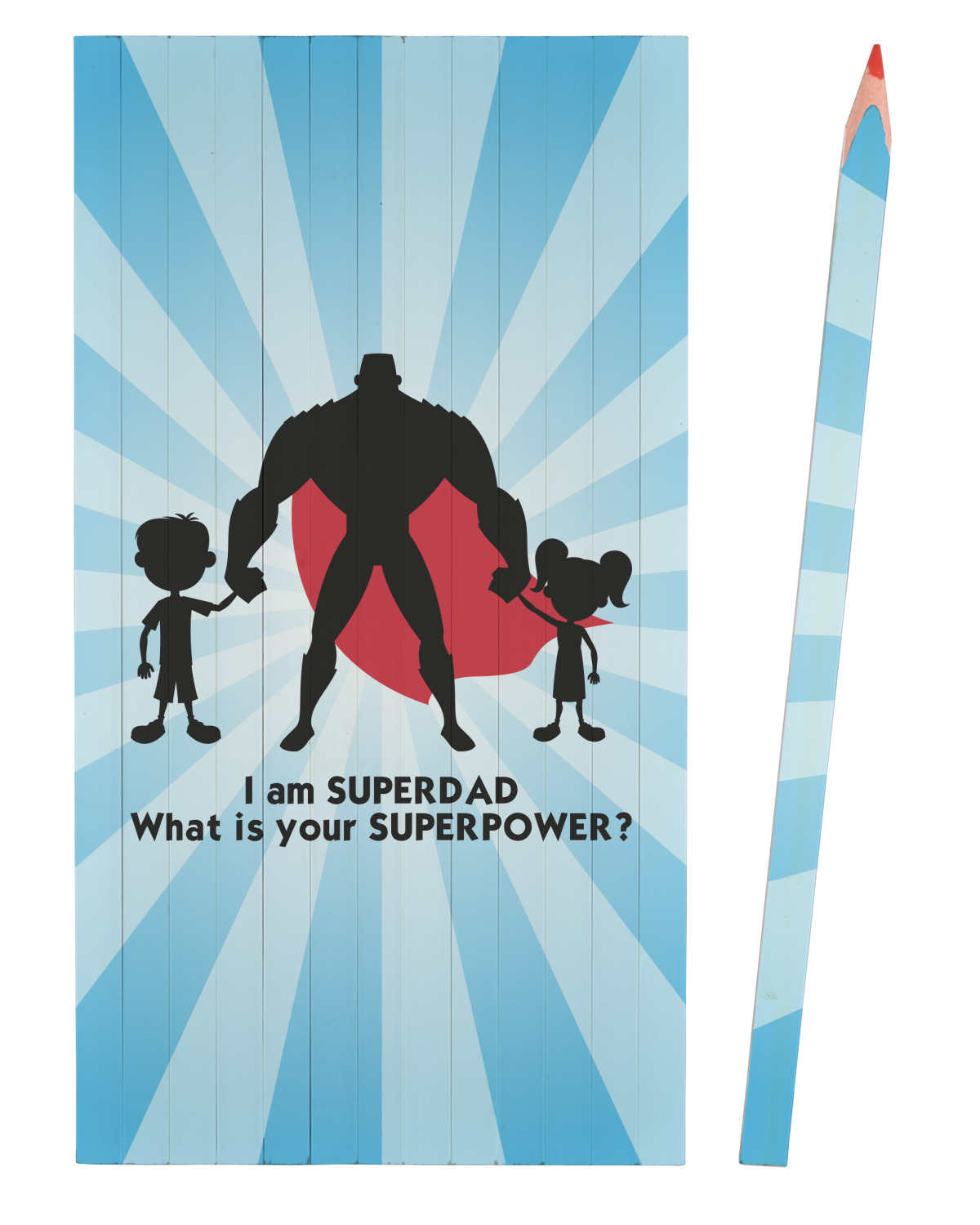 Our dads are our superheroes and this super dad design reflects that. Our design depicts a superhero male holding hands with a little boy and girl. Our super hero dad is wearing a red cape. We used a starburst in blue to really highlight our superhero dad!