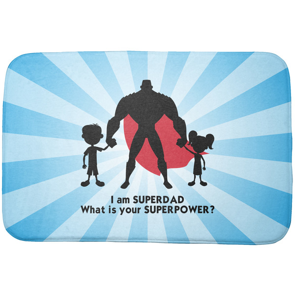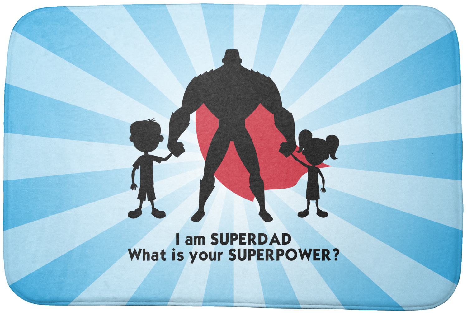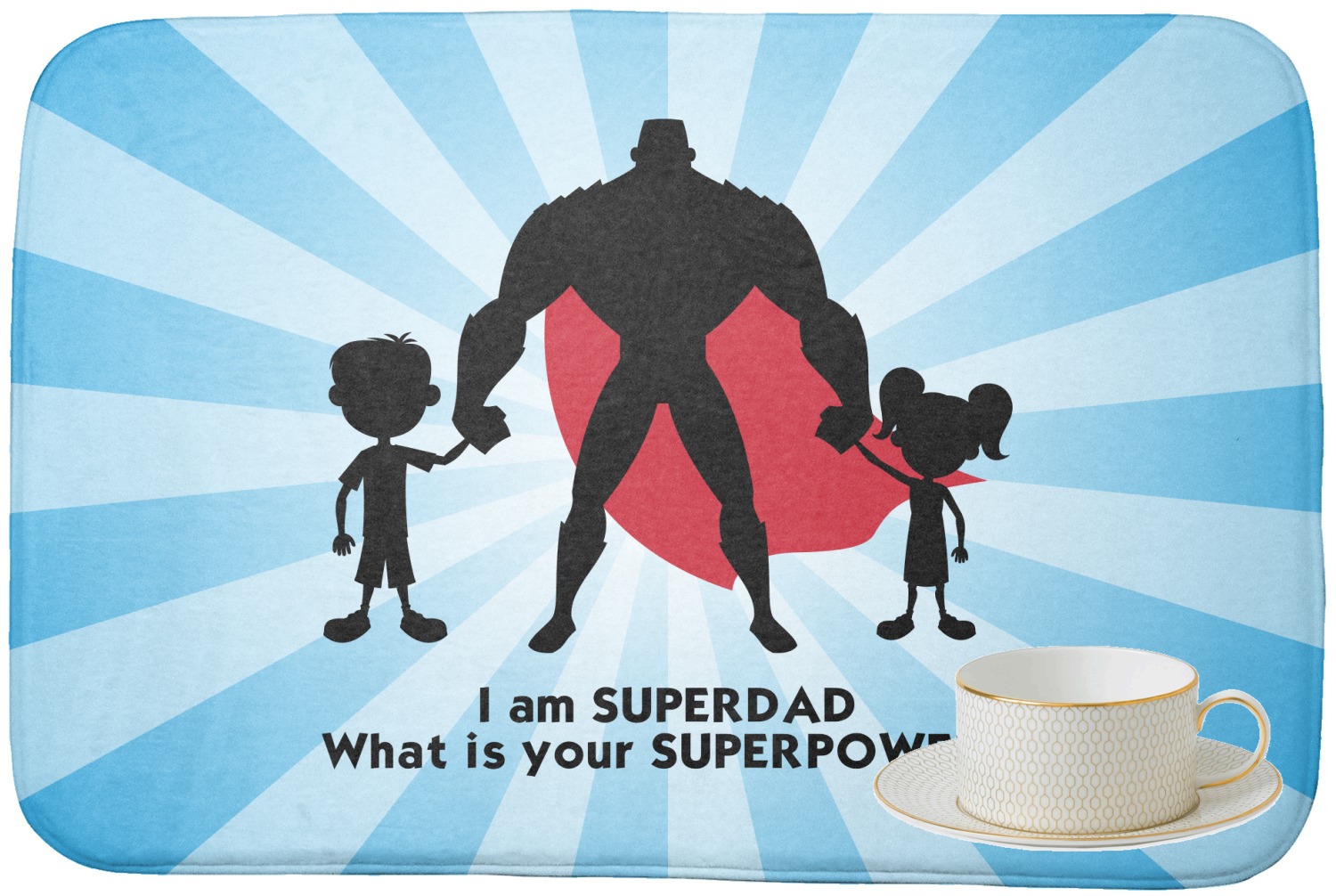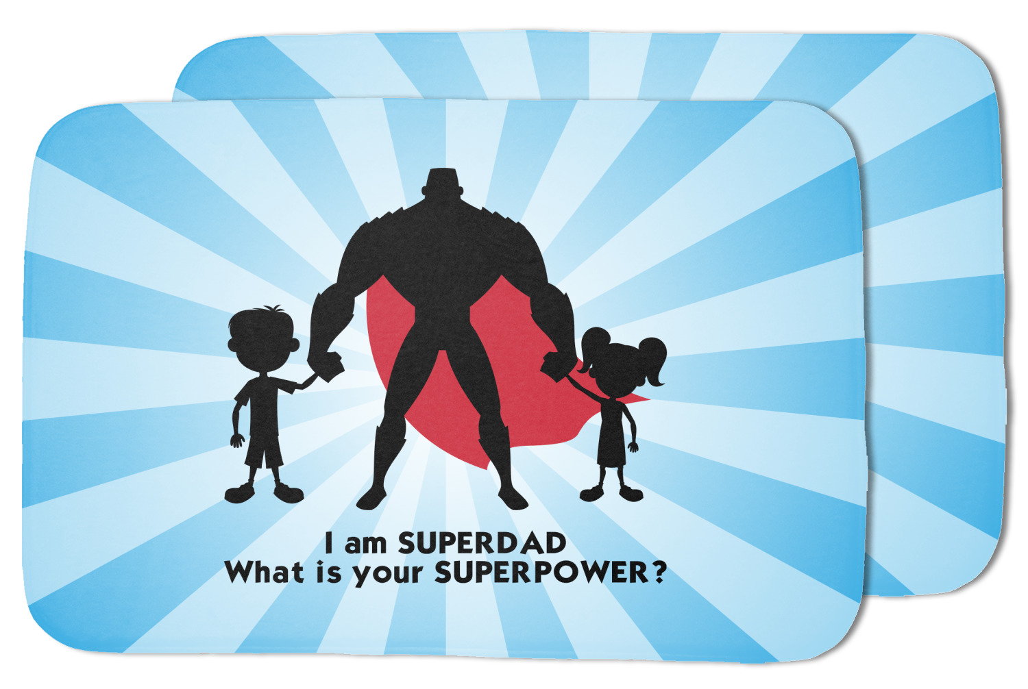 Our dads are our superheroes and this super dad design reflects that. Our design depicts a superhero male holding hands with a little boy and girl. Our super hero dad is wearing a red cape. We used a starburst in blue to really highlight our superhero dad!