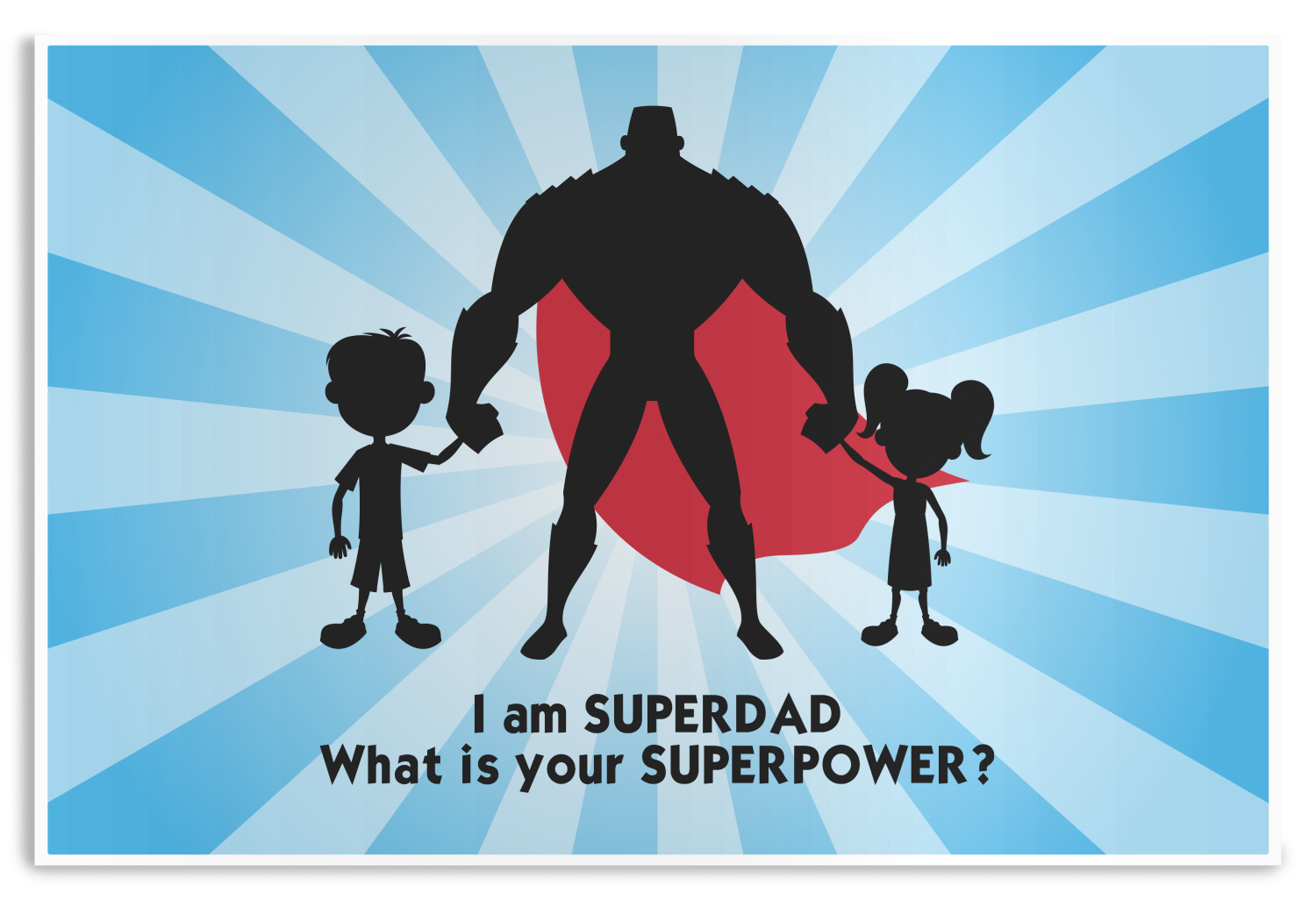 Our dads are our superheroes and this super dad design reflects that. Our design depicts a superhero male holding hands with a little boy and girl. Our super hero dad is wearing a red cape. We used a starburst in blue to really highlight our superhero dad!