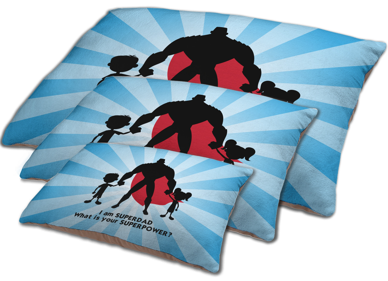 Our dads are our superheroes and this super dad design reflects that. Our design depicts a superhero male holding hands with a little boy and girl. Our super hero dad is wearing a red cape. We used a starburst in blue to really highlight our superhero dad!