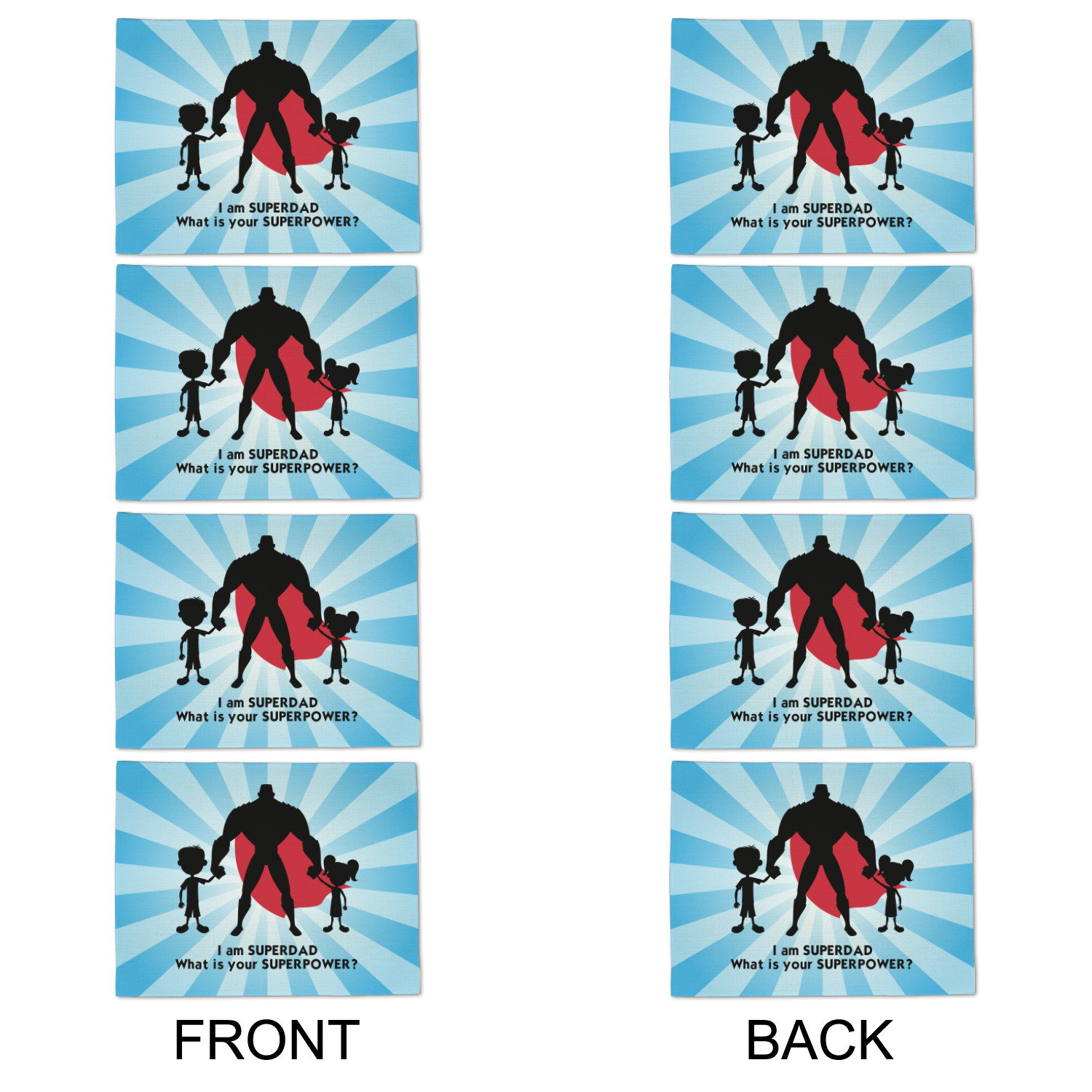 Our customization and rendering system allows you to customize and personalize the design to your liking. You are able to change the colors on the starburst, the colors of the graphic and of course the cape. We chose to use the text "I am a super dad. What is your super power?"; you can use whatever text you like.