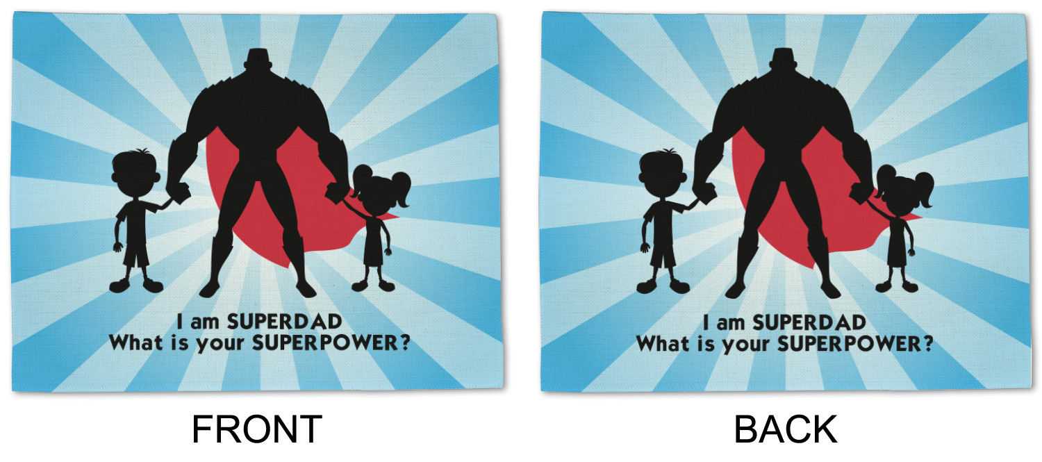 Our customization and rendering system allows you to customize and personalize the design to your liking. You are able to change the colors on the starburst, the colors of the graphic and of course the cape. We chose to use the text "I am a super dad. What is your super power?"; you can use whatever text you like.