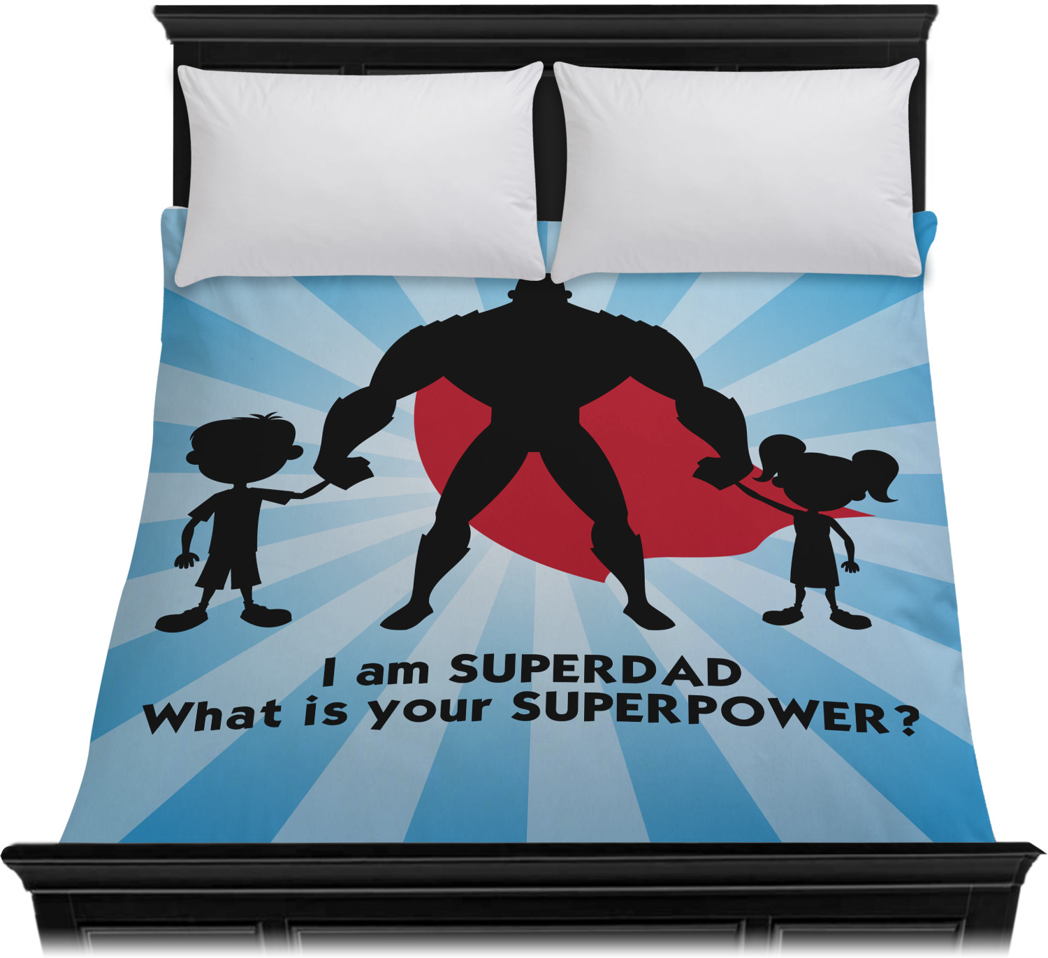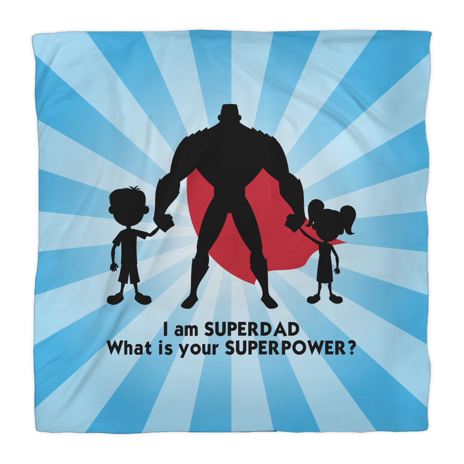 Our dads are our superheroes and this super dad design reflects that. Our design depicts a superhero male holding hands with a little boy and girl. Our super hero dad is wearing a red cape. We used a starburst in blue to really highlight our superhero dad!