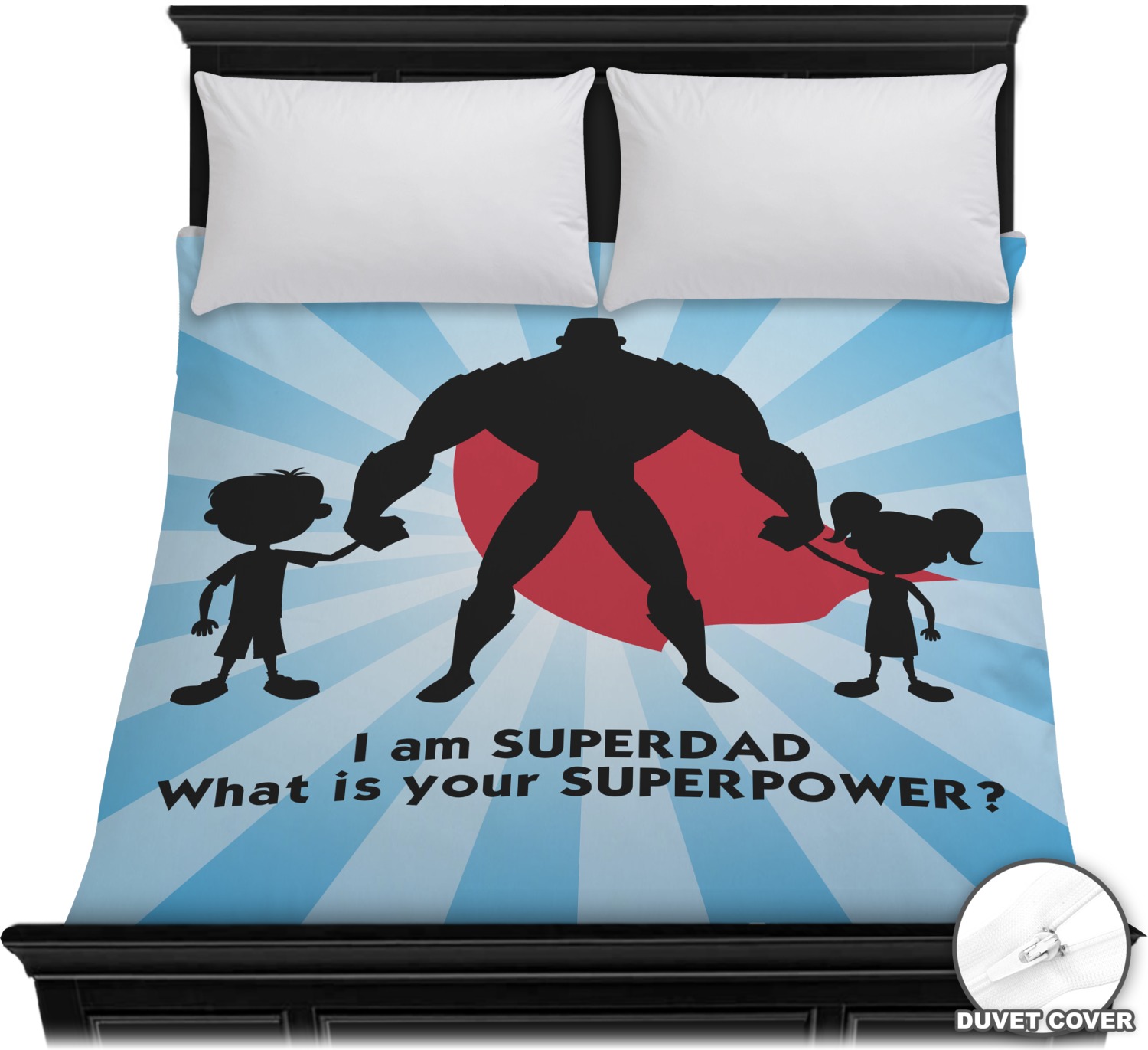 Our customization and rendering system allows you to customize and personalize the design to your liking. You are able to change the colors on the starburst, the colors of the graphic and of course the cape. We chose to use the text "I am a super dad. What is your super power?"; you can use whatever text you like.