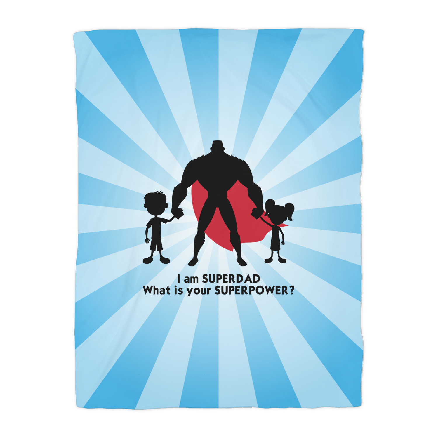 Our dads are our superheroes and this super dad design reflects that. Our design depicts a superhero male holding hands with a little boy and girl. Our super hero dad is wearing a red cape. We used a starburst in blue to really highlight our superhero dad!