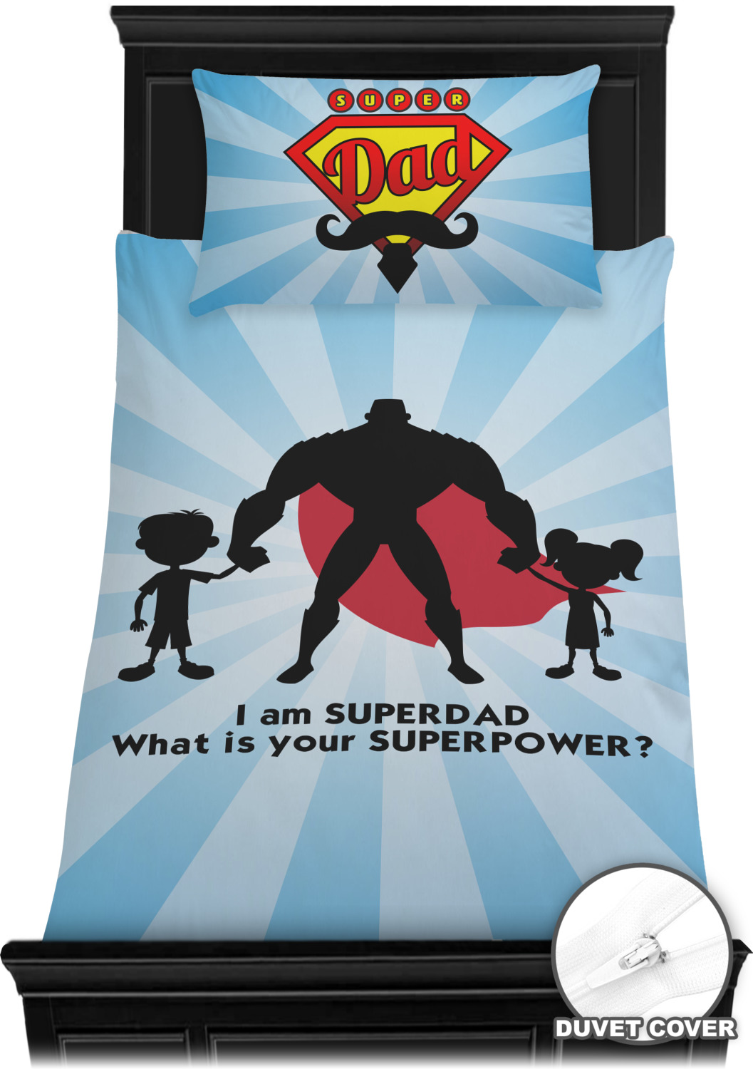 Our dads are our superheroes and this super dad design reflects that. Our design depicts a superhero male holding hands with a little boy and girl. Our super hero dad is wearing a red cape. We used a starburst in blue to really highlight our superhero dad!
