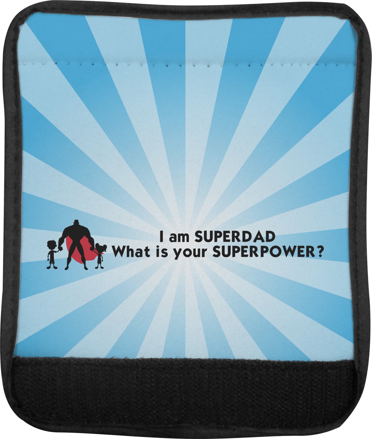 Our dads are our superheroes and this super dad design reflects that. Our design depicts a superhero male holding hands with a little boy and girl. Our super hero dad is wearing a red cape. We used a starburst in blue to really highlight our superhero dad!
