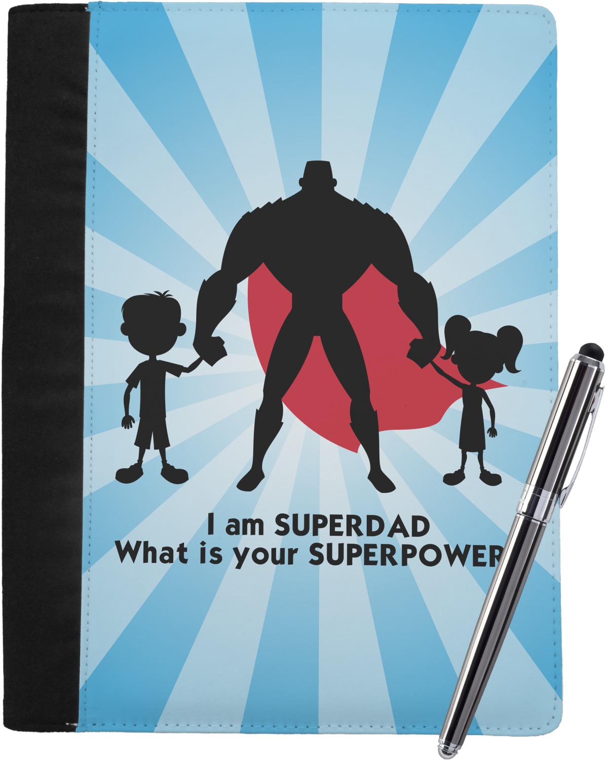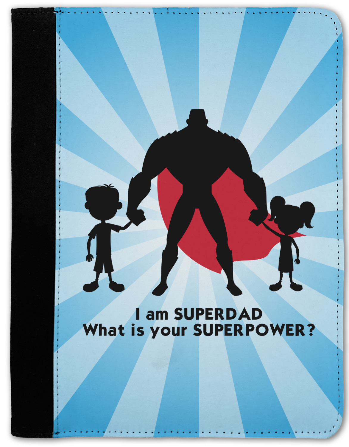 Our dads are our superheroes and this super dad design reflects that. Our design depicts a superhero male holding hands with a little boy and girl. Our super hero dad is wearing a red cape. We used a starburst in blue to really highlight our superhero dad!