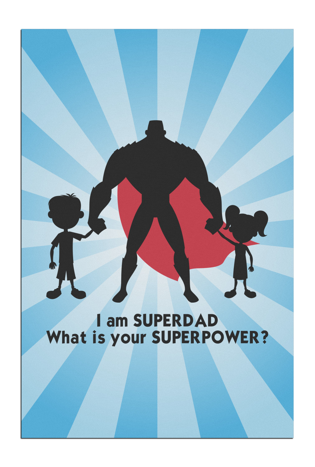 Our dads are our superheroes and this super dad design reflects that. Our design depicts a superhero male holding hands with a little boy and girl. Our super hero dad is wearing a red cape. We used a starburst in blue to really highlight our superhero dad!