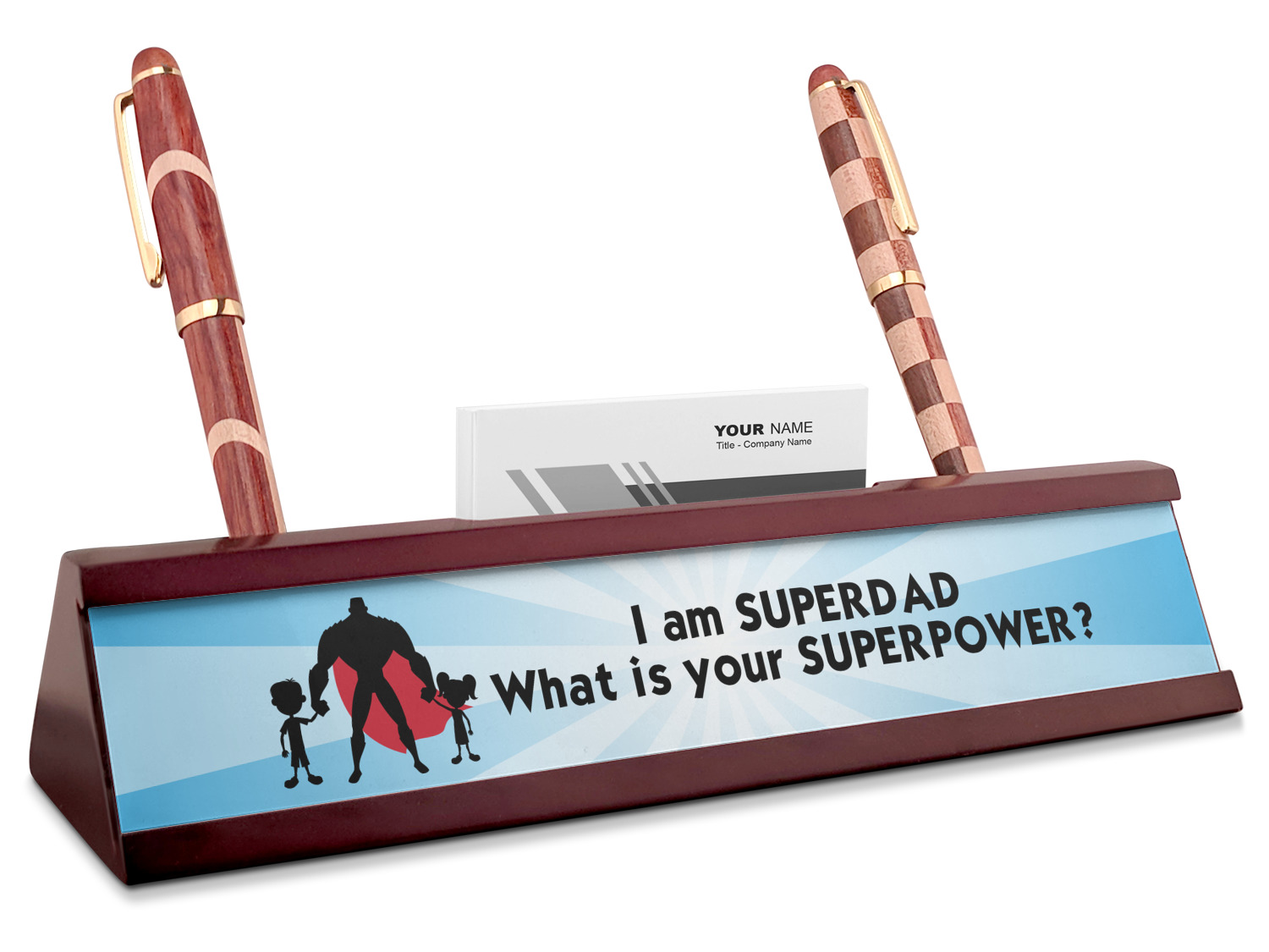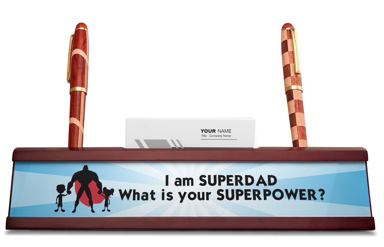Your desk name plates are crafted from a high-quality, dark-cherry mahogany. At approximately 9.5 by 1.875 by 2.5 inches, this name plaque will fit perfectly, front and center, on your desk. Your customization spans across the entire face of the nameplate. Behind the nameplate lies a skinny slot that can fit approximately 15, traditionally-sized, business cards. You can also store your writing utensils on either side of this custom desk name plate.