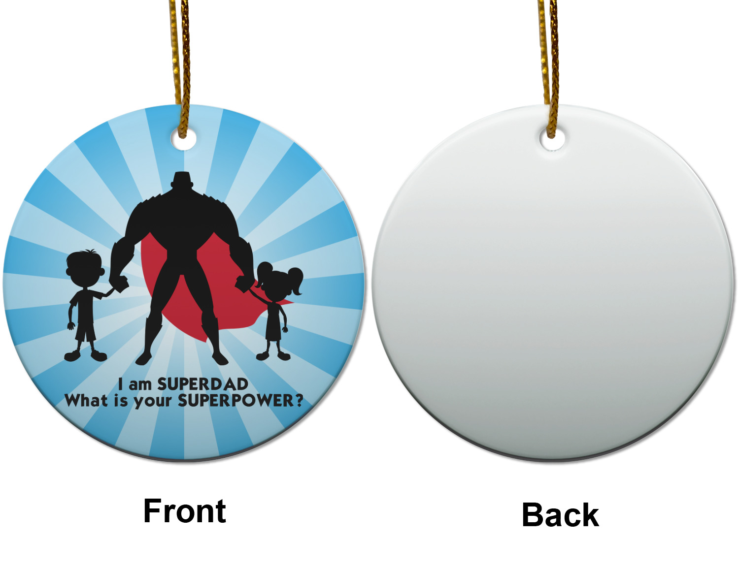 Our customization and rendering system allows you to customize and personalize the design to your liking. You are able to change the colors on the starburst, the colors of the graphic and of course the cape. We chose to use the text "I am a super dad. What is your super power?"; you can use whatever text you like.
