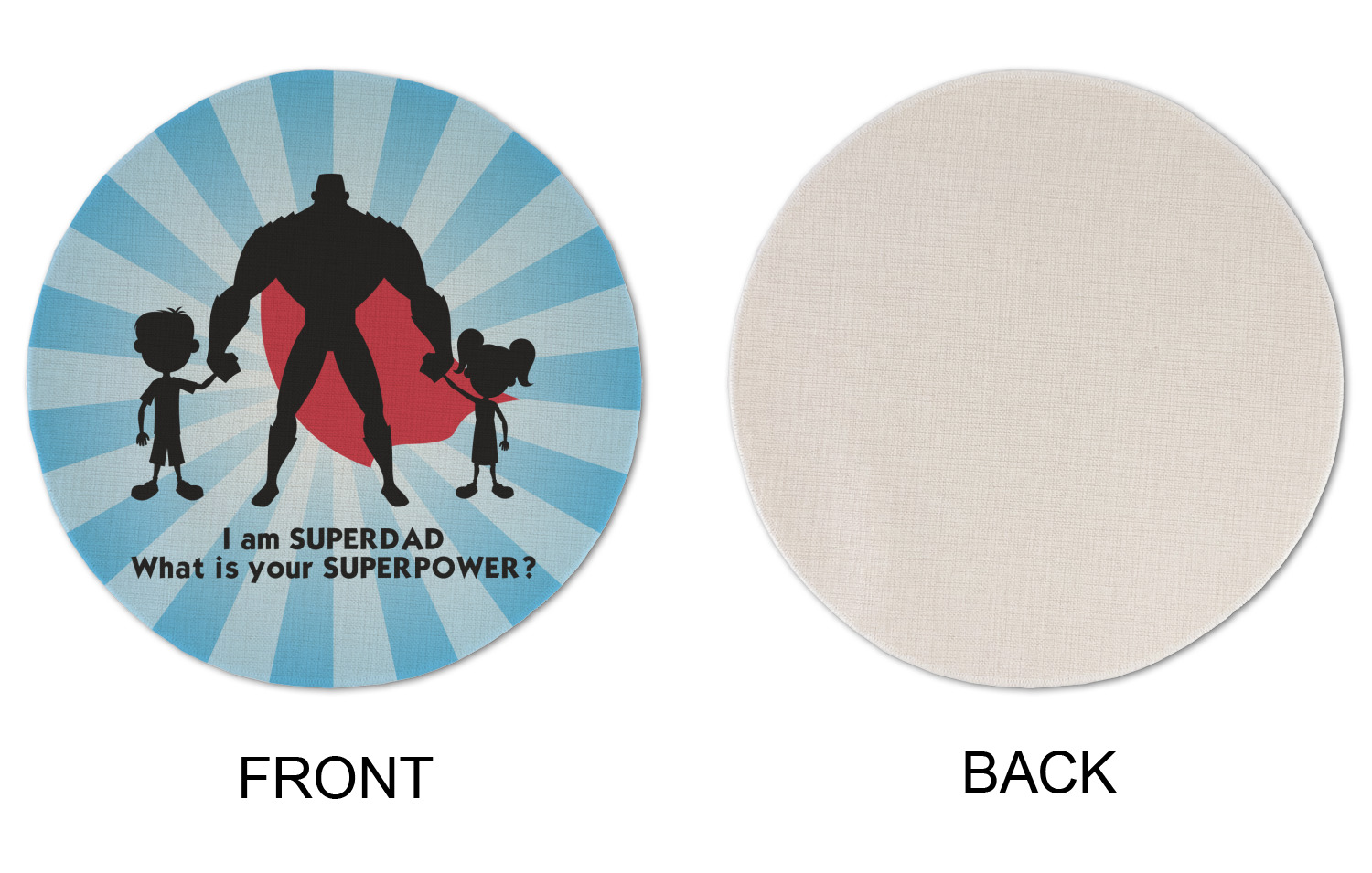 Our customization and rendering system allows you to customize and personalize the design to your liking. You are able to change the colors on the starburst, the colors of the graphic and of course the cape. We chose to use the text "I am a super dad. What is your super power?"; you can use whatever text you like.