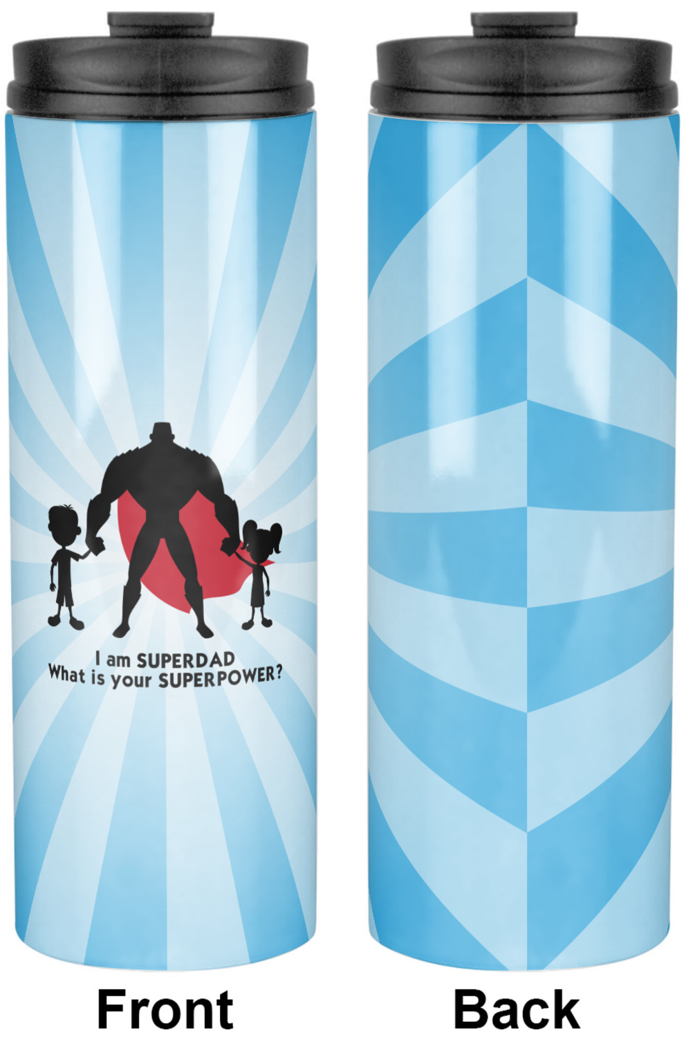 Our customization and rendering system allows you to customize and personalize the design to your liking. You are able to change the colors on the starburst, the colors of the graphic and of course the cape. We chose to use the text "I am a super dad. What is your super power?"; you can use whatever text you like.
