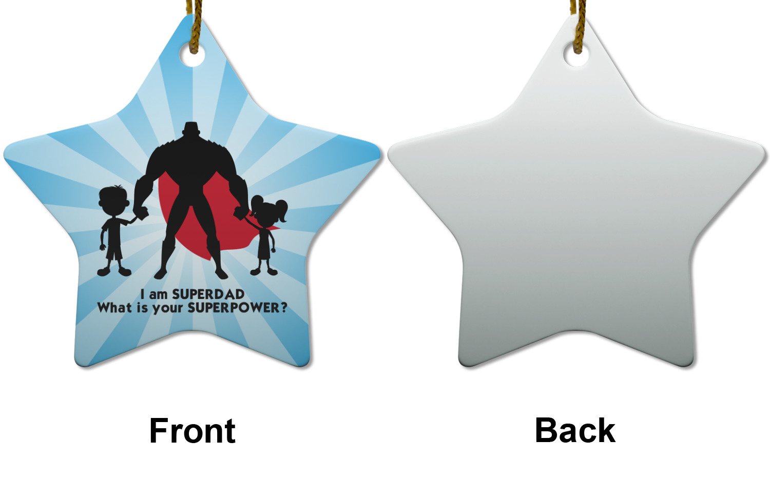 Our customization and rendering system allows you to customize and personalize the design to your liking. You are able to change the colors on the starburst, the colors of the graphic and of course the cape. We chose to use the text "I am a super dad. What is your super power?"; you can use whatever text you like.