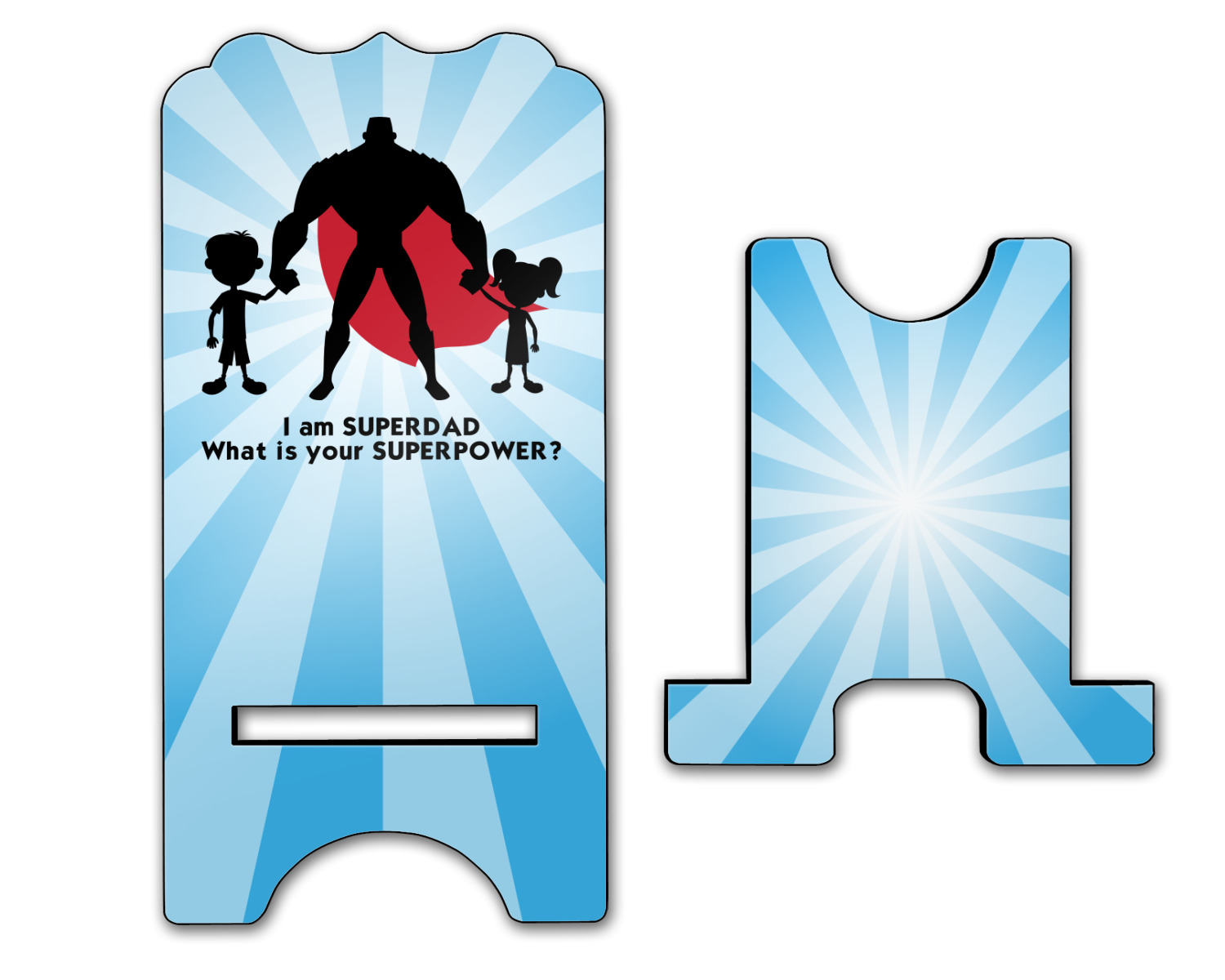Our dads are our superheroes and this super dad design reflects that. Our design depicts a superhero male holding hands with a little boy and girl. Our super hero dad is wearing a red cape. We used a starburst in blue to really highlight our superhero dad!