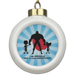 Our dads are our superheroes and this super dad design reflects that. Our design depicts a superhero male holding hands with a little boy and girl. Our super hero dad is wearing a red cape. We used a starburst in blue to really highlight our superhero dad!