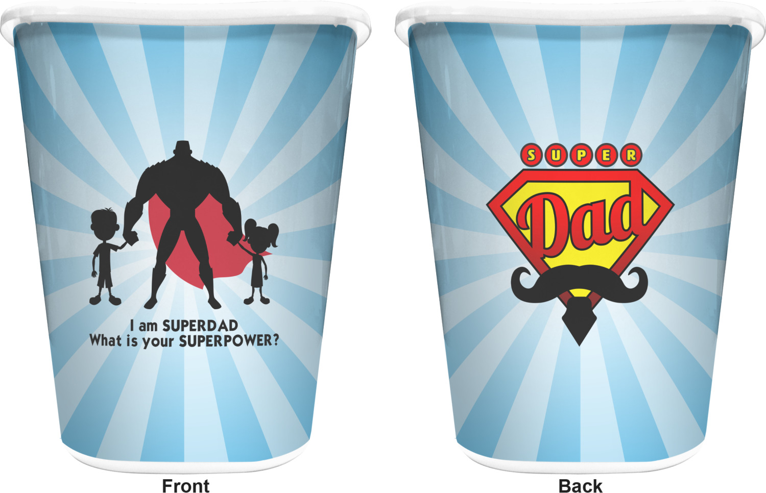 Our customization and rendering system allows you to customize and personalize the design to your liking. You are able to change the colors on the starburst, the colors of the graphic and of course the cape. We chose to use the text "I am a super dad. What is your super power?"; you can use whatever text you like.