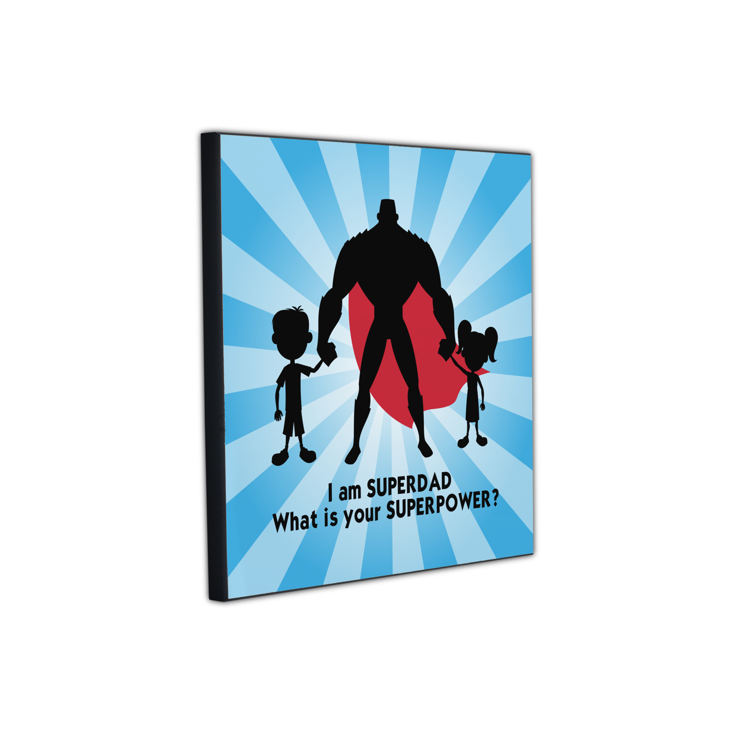 Our dads are our superheroes and this super dad design reflects that. Our design depicts a superhero male holding hands with a little boy and girl. Our super hero dad is wearing a red cape. We used a starburst in blue to really highlight our superhero dad!
