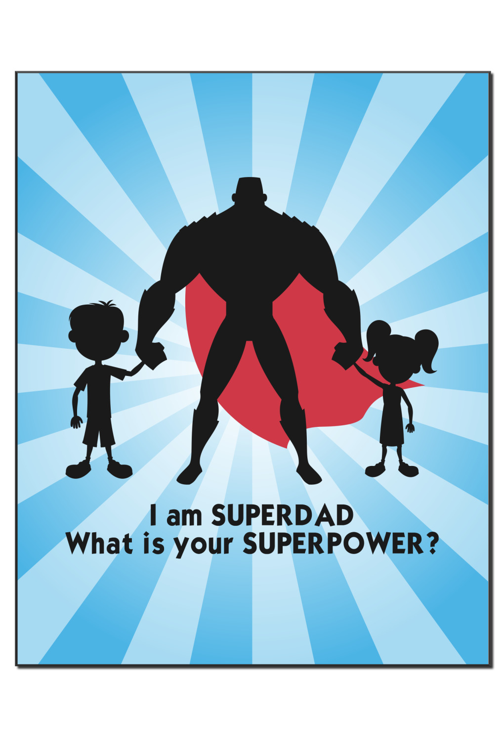 Our dads are our superheroes and this super dad design reflects that. Our design depicts a superhero male holding hands with a little boy and girl. Our super hero dad is wearing a red cape. We used a starburst in blue to really highlight our superhero dad!