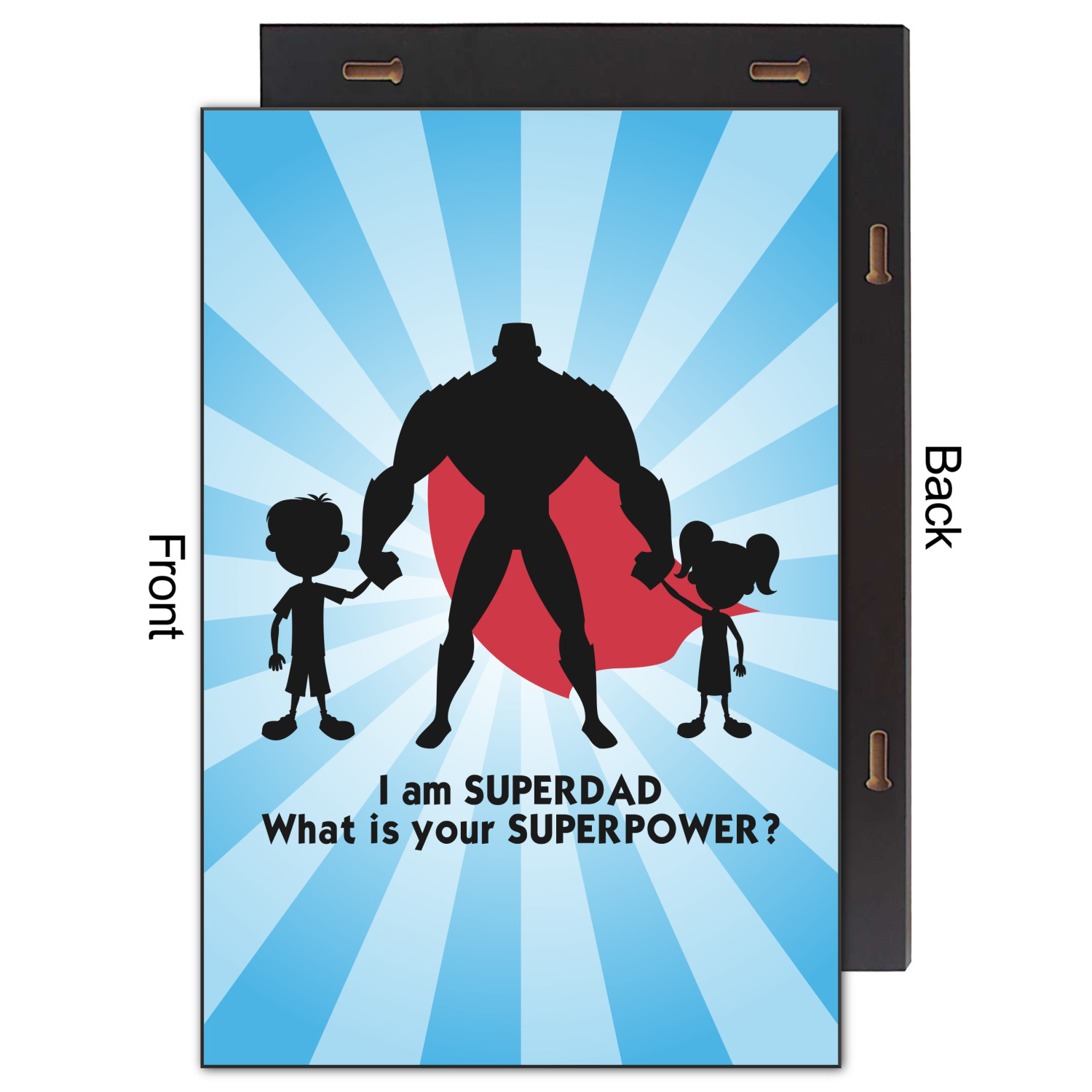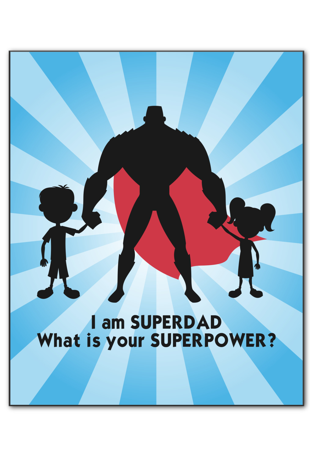 Our dads are our superheroes and this super dad design reflects that. Our design depicts a superhero male holding hands with a little boy and girl. Our super hero dad is wearing a red cape. We used a starburst in blue to really highlight our superhero dad!