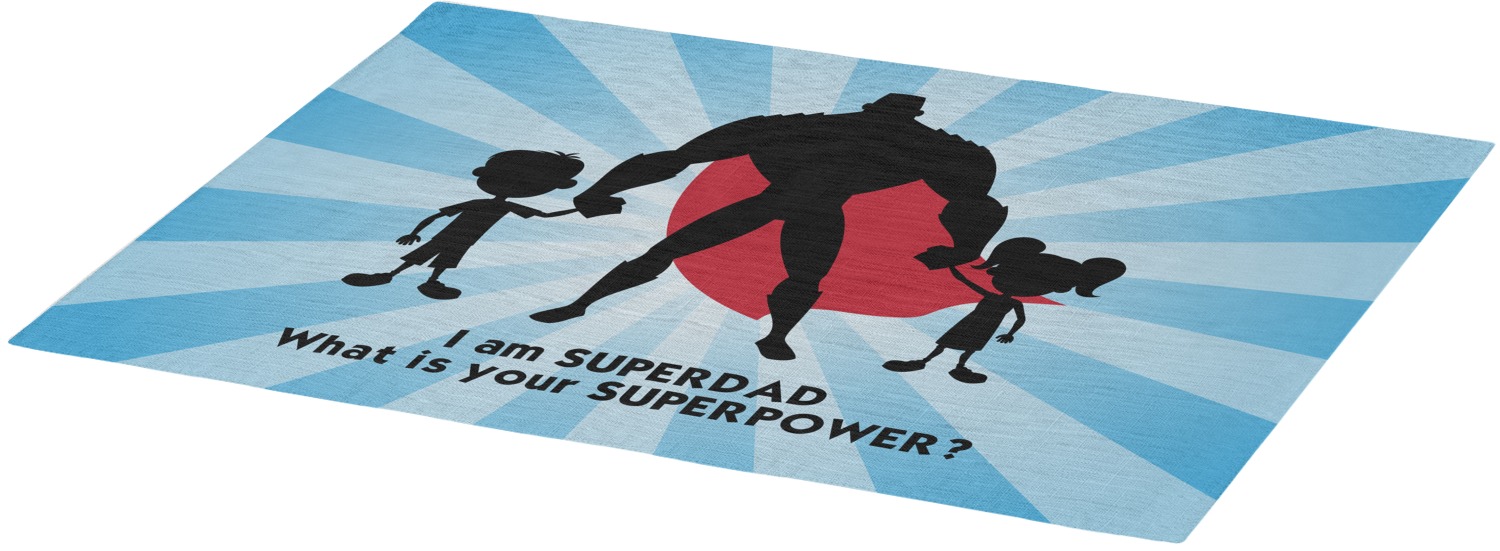 Our dads are our superheroes and this super dad design reflects that. Our design depicts a superhero male holding hands with a little boy and girl. Our super hero dad is wearing a red cape. We used a starburst in blue to really highlight our superhero dad!