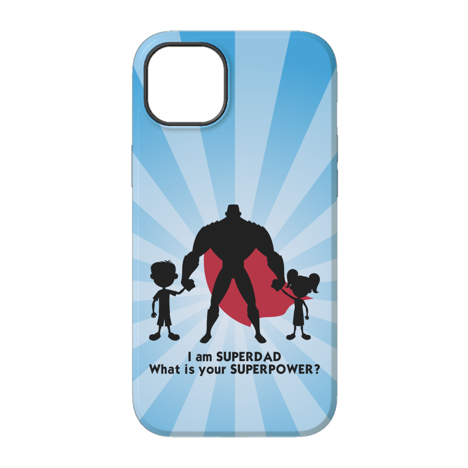 Our dads are our superheroes and this super dad design reflects that. Our design depicts a superhero male holding hands with a little boy and girl. Our super hero dad is wearing a red cape. We used a starburst in blue to really highlight our superhero dad!