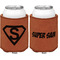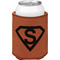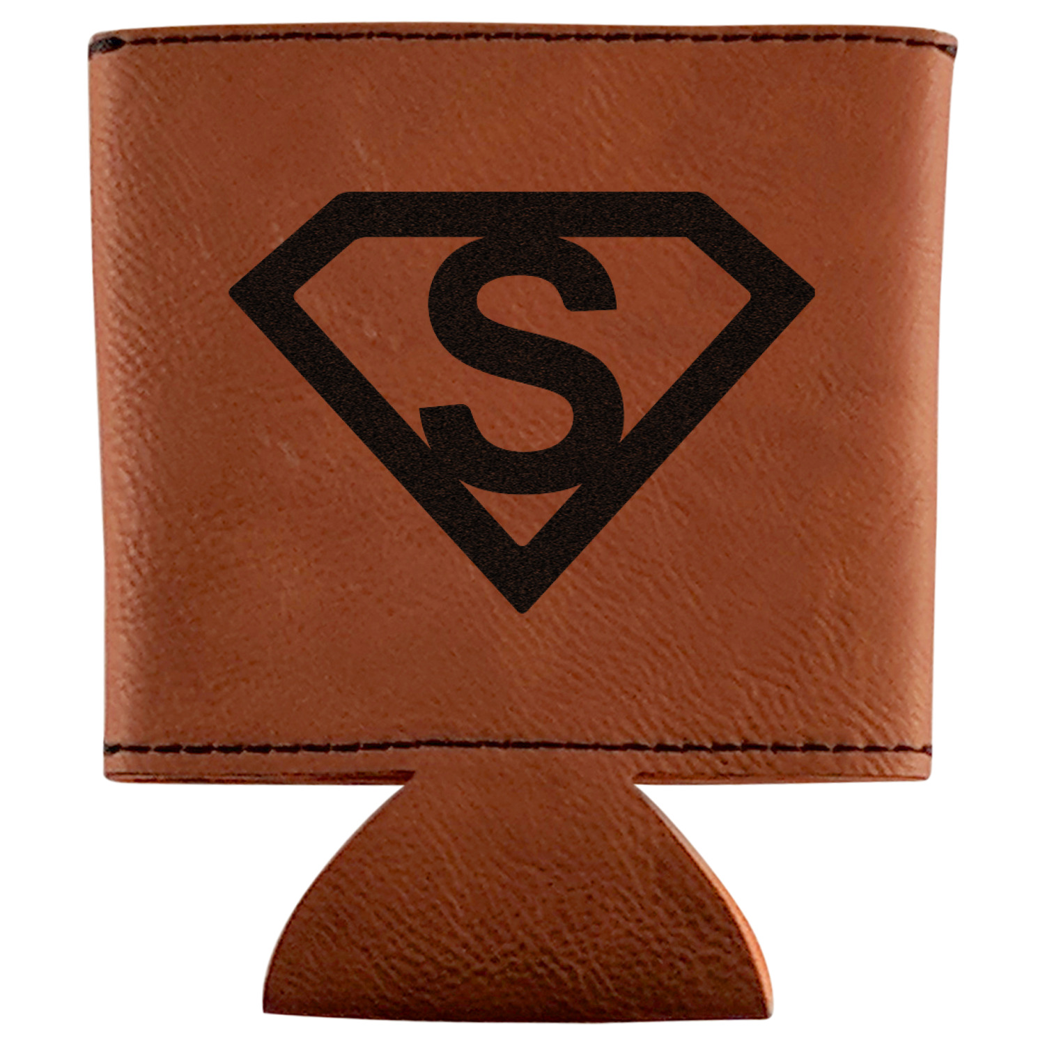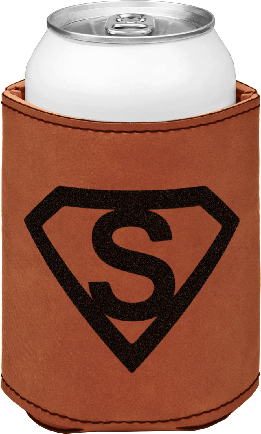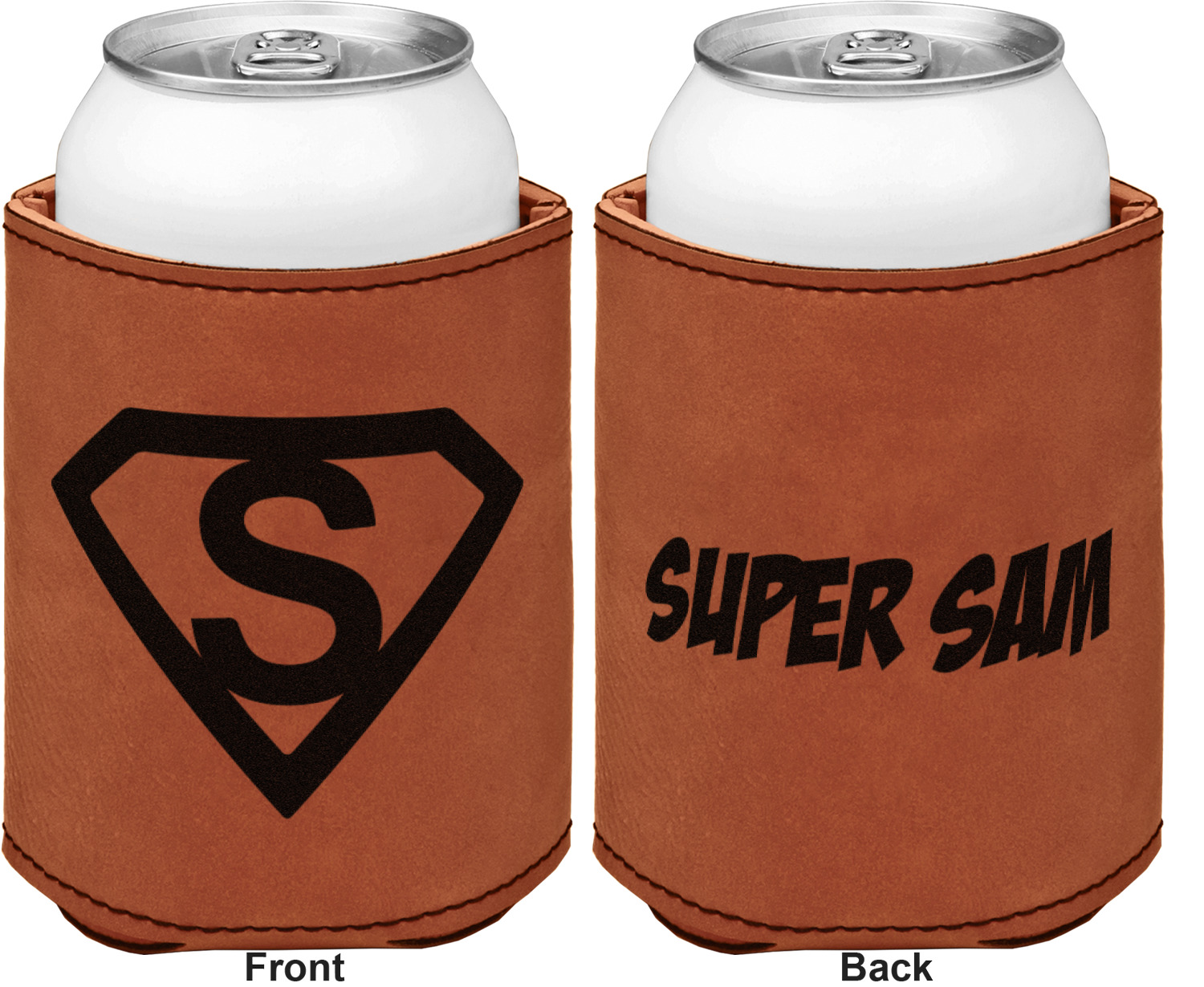 This can sleeve is made from a cognac-brown leatherette and stitched with a sturdy, black thread. A slim padding lines the inside of your can sleeve to allow for a better fit once your drink is inserted. The sleeve itself measures at 4 by 4.5 inches, allowing this custom can sleeve to accommodate most canned drinks. Your personalized design can be engraved on the front and back, or solely the front. When laser-engraved, your design appears as a black coloration which contrasts the leatherette nicely.