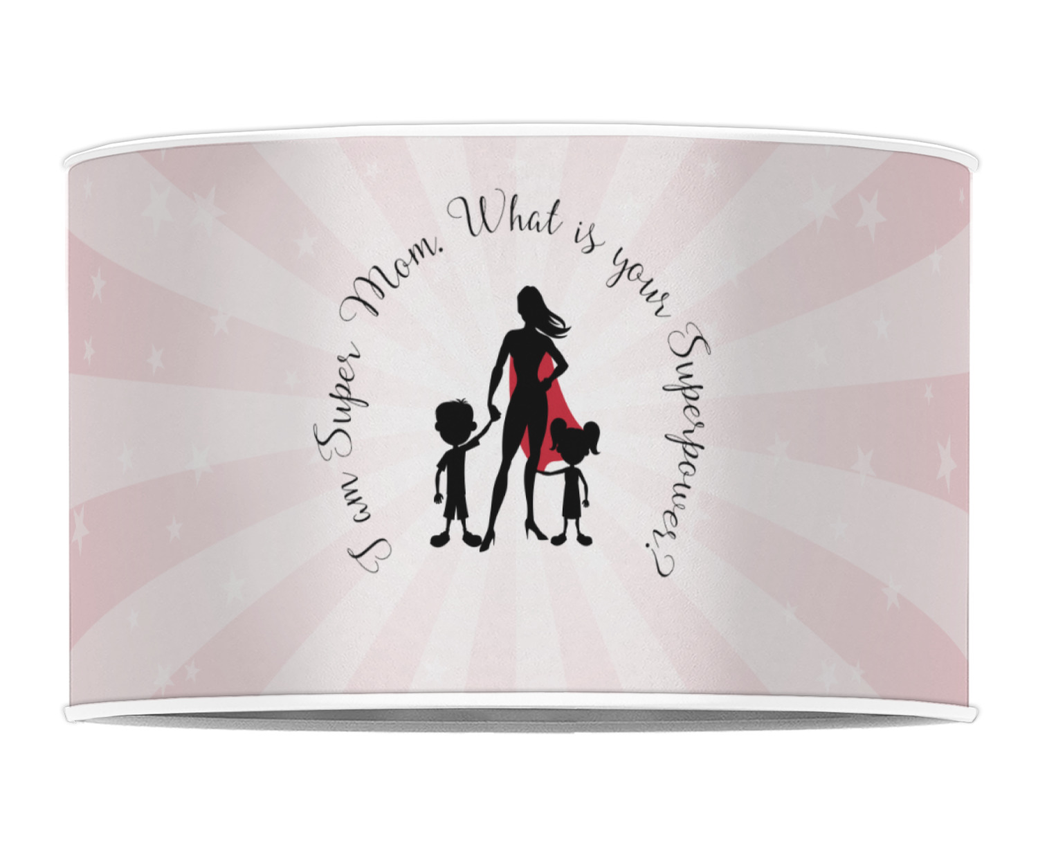 Our Super Mom design is perfect for your Mother's Day Gift. Moms today are truly super heroes with all that they have to balance. Our adorable design depicts a super hero mom / woman holding hands with a little boy and a little girl. Our super hero mom is wearing a red cape. We used a blush colored starburst with stars to highlight our beautiful mother. We personalized with our new circular text and used the words "I am a Super Mom. What is your Superpower?". We use a scripty girly font. We think the design looks outstanding!