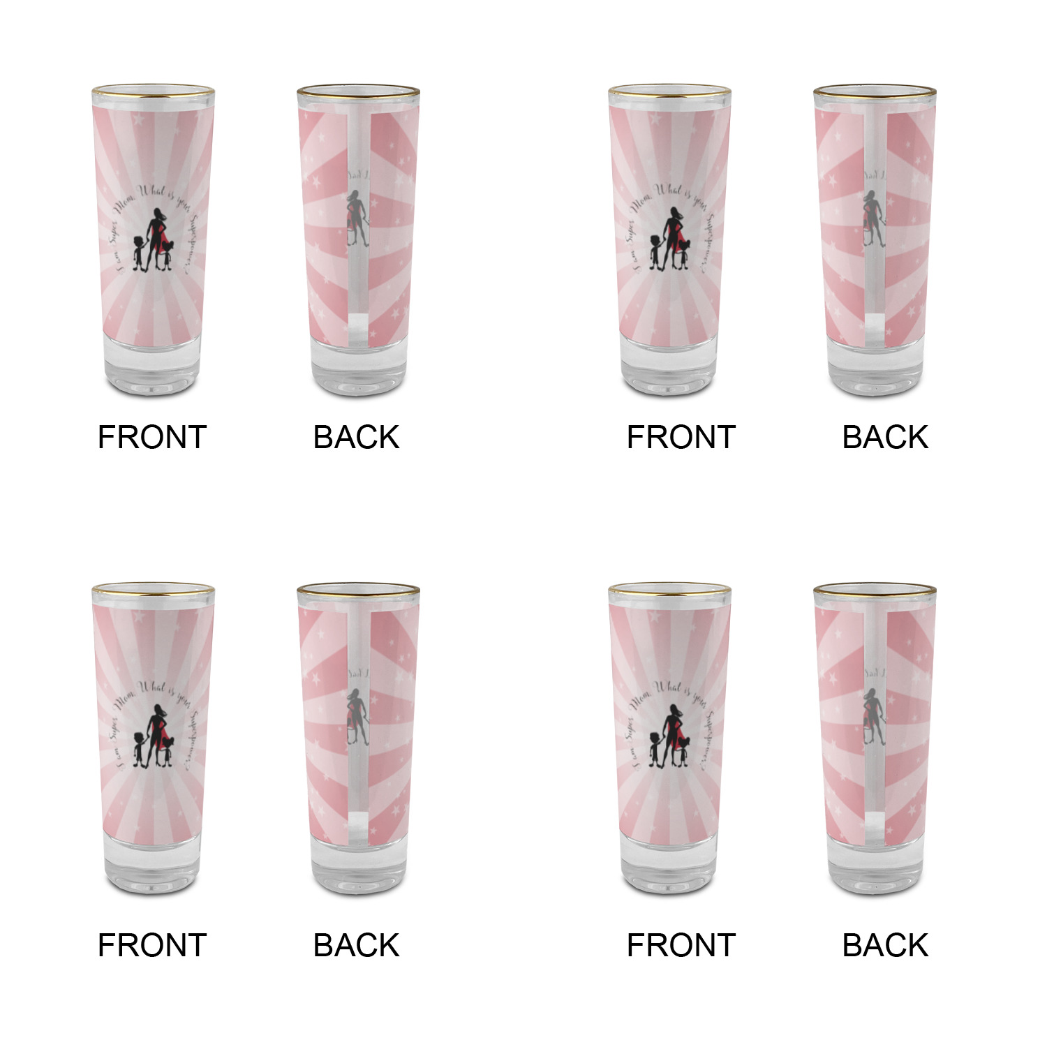These glass shooter glasses are printed in full color with the design of your choice. These are a tall shooter 2 oz size and stand 4" tall. The print is a full wrap design to boldly display your personalization.