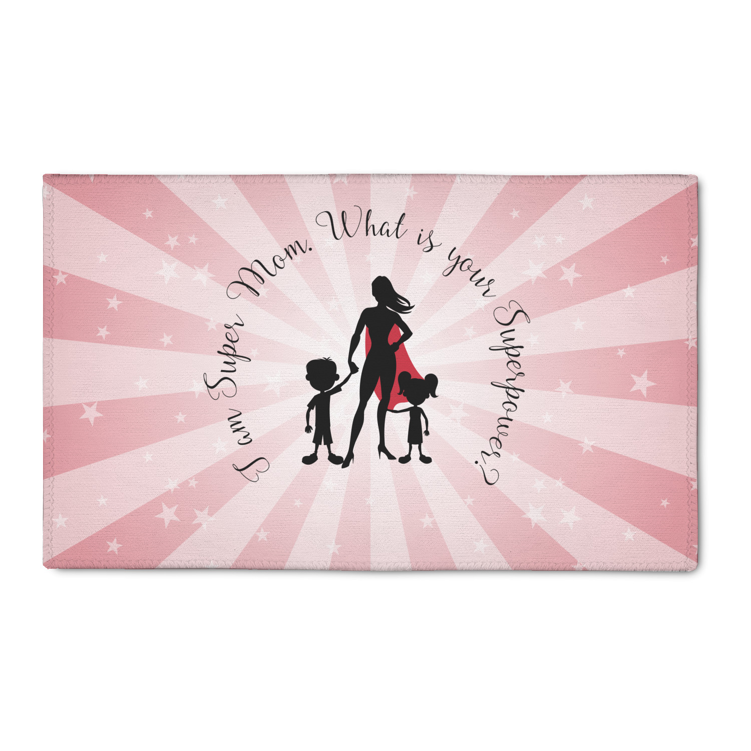 Our Super Mom design is perfect for your Mother's Day Gift. Moms today are truly super heroes with all that they have to balance. Our adorable design depicts a super hero mom / woman holding hands with a little boy and a little girl. Our super hero mom is wearing a red cape. We used a blush colored starburst with stars to highlight our beautiful mother. We personalized with our new circular text and used the words "I am a Super Mom. What is your Superpower?". We use a scripty girly font. We think the design looks outstanding!