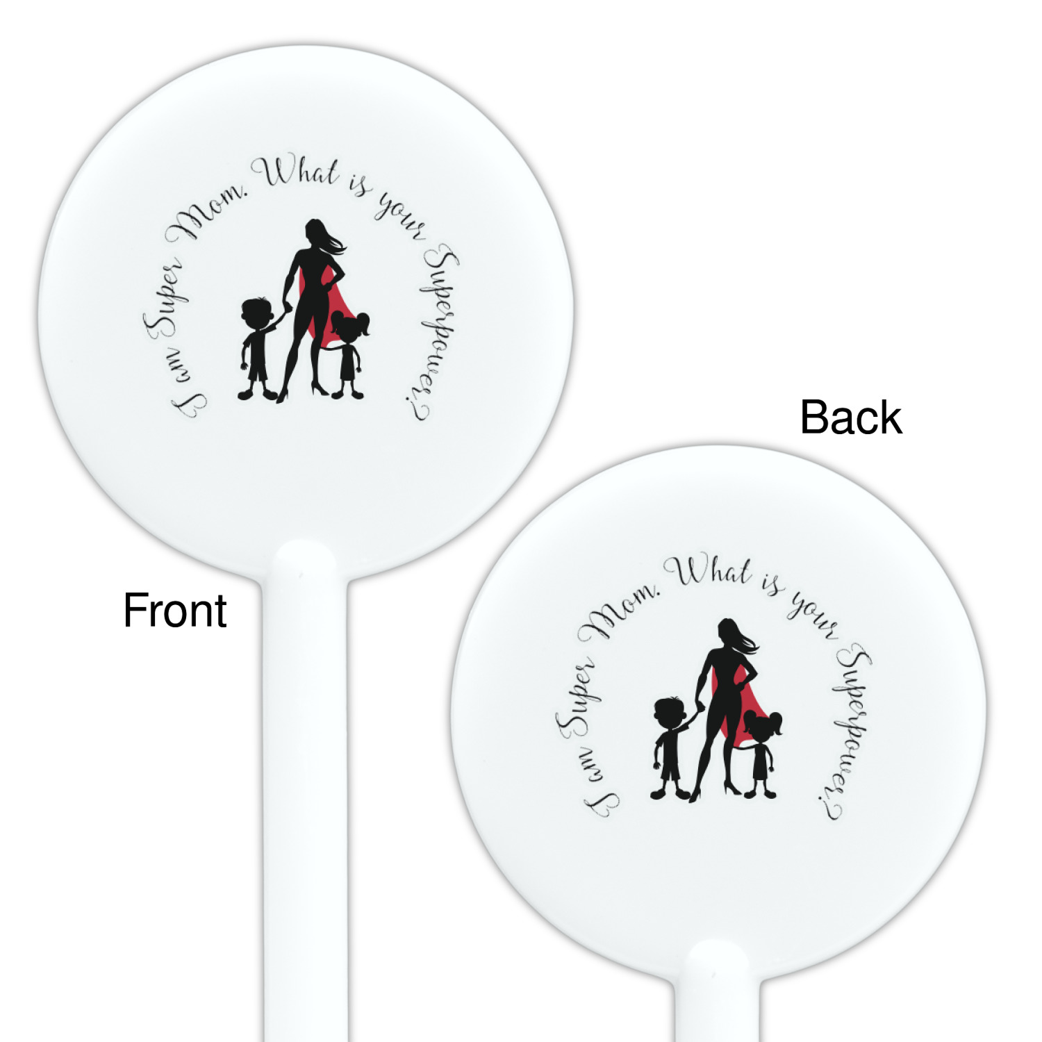 Our Super Mom design is perfect for your Mother's Day Gift. Moms today are truly super heroes with all that they have to balance. Our adorable design depicts a super hero mom / woman holding hands with a little boy and a little girl. Our super hero mom is wearing a red cape. We used a blush colored starburst with stars to highlight our beautiful mother. We personalized with our new circular text and used the words "I am a Super Mom. What is your Superpower?". We use a scripty girly font. We think the design looks outstanding!