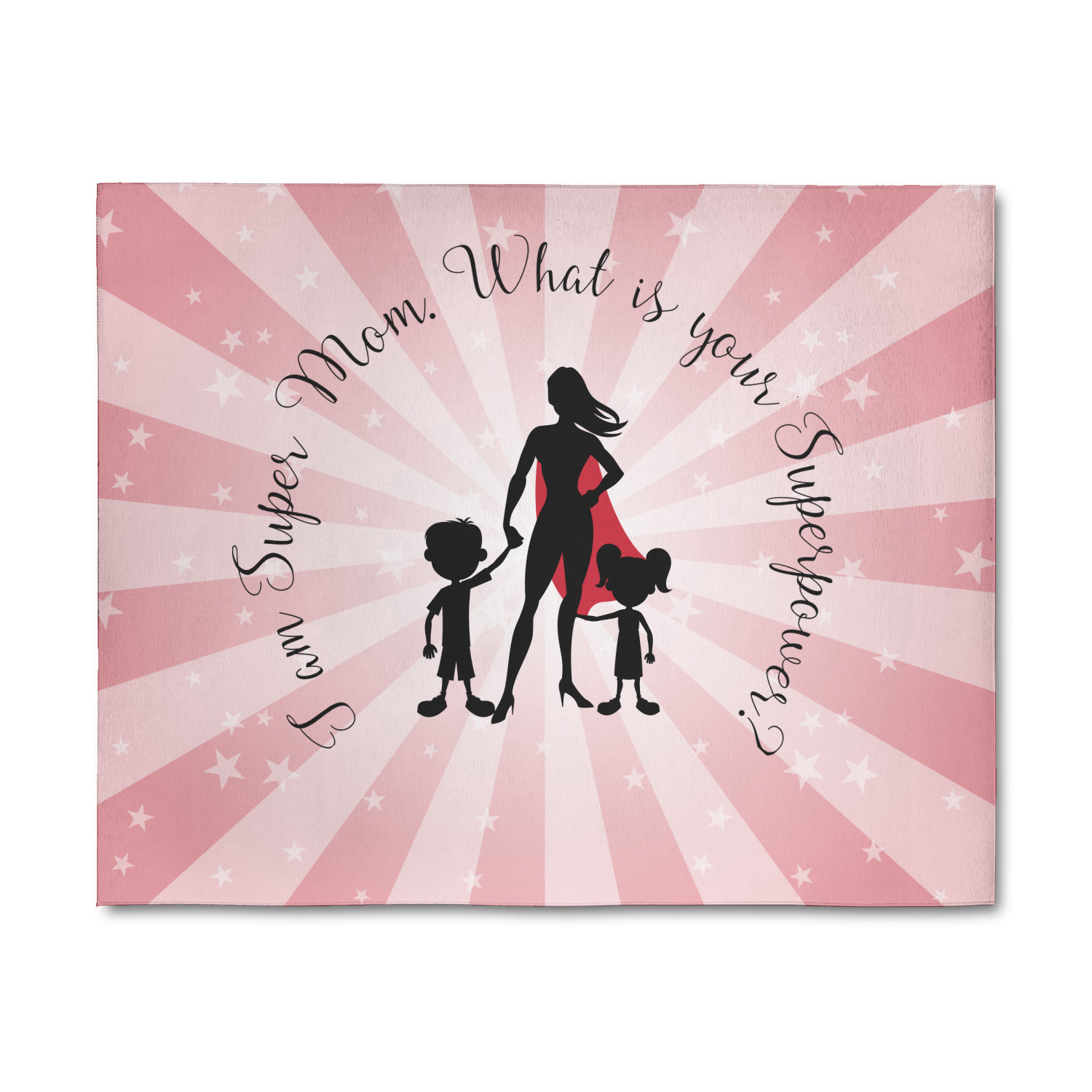 Our Super Mom design is perfect for your Mother's Day Gift. Moms today are truly super heroes with all that they have to balance. Our adorable design depicts a super hero mom / woman holding hands with a little boy and a little girl. Our super hero mom is wearing a red cape. We used a blush colored starburst with stars to highlight our beautiful mother. We personalized with our new circular text and used the words "I am a Super Mom. What is your Superpower?". We use a scripty girly font. We think the design looks outstanding!