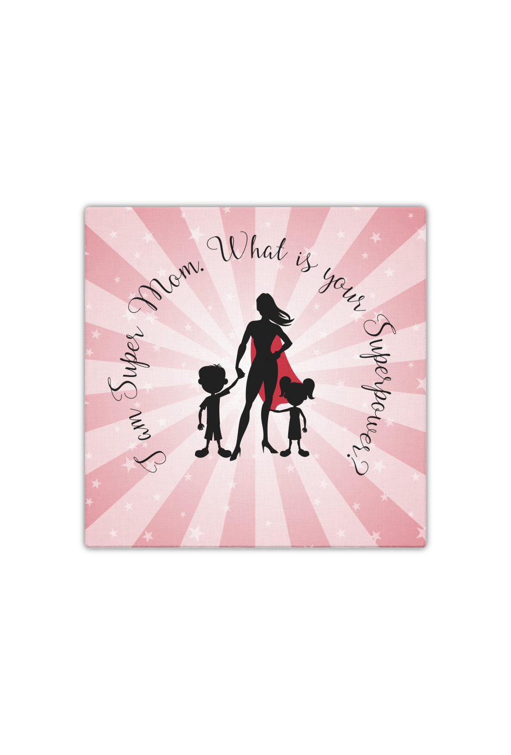 Our Super Mom design is perfect for your Mother's Day Gift. Moms today are truly super heroes with all that they have to balance. Our adorable design depicts a super hero mom / woman holding hands with a little boy and a little girl. Our super hero mom is wearing a red cape. We used a blush colored starburst with stars to highlight our beautiful mother. We personalized with our new circular text and used the words "I am a Super Mom. What is your Superpower?". We use a scripty girly font. We think the design looks outstanding!