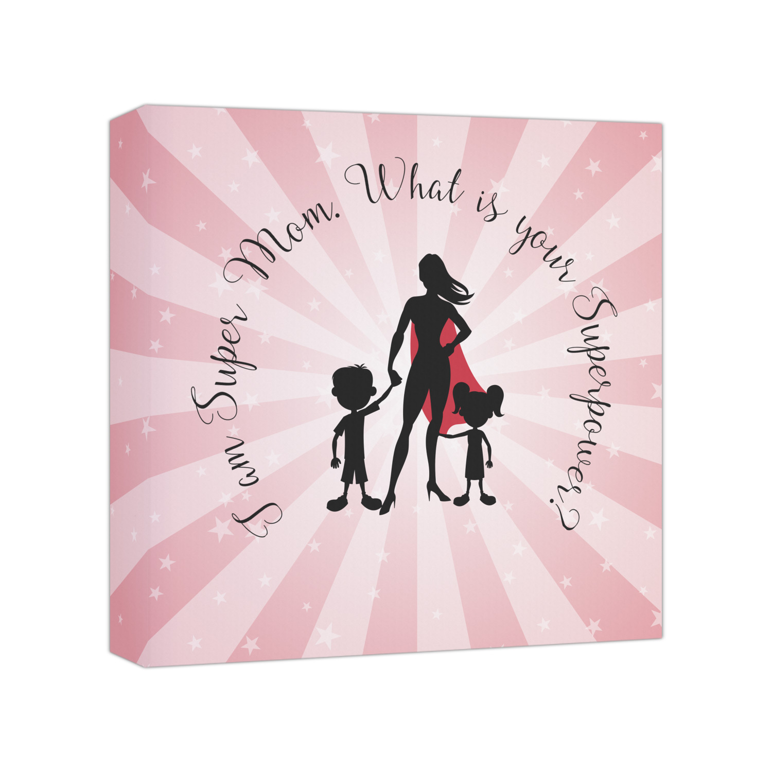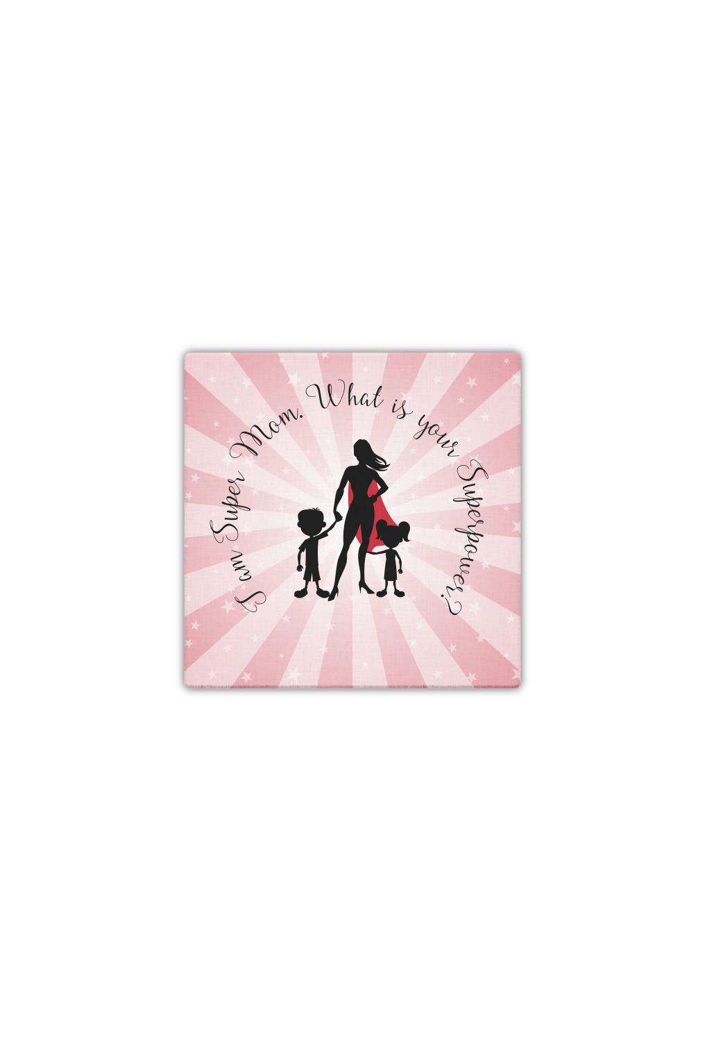 Our Super Mom design is perfect for your Mother's Day Gift. Moms today are truly super heroes with all that they have to balance. Our adorable design depicts a super hero mom / woman holding hands with a little boy and a little girl. Our super hero mom is wearing a red cape. We used a blush colored starburst with stars to highlight our beautiful mother. We personalized with our new circular text and used the words "I am a Super Mom. What is your Superpower?". We use a scripty girly font. We think the design looks outstanding!