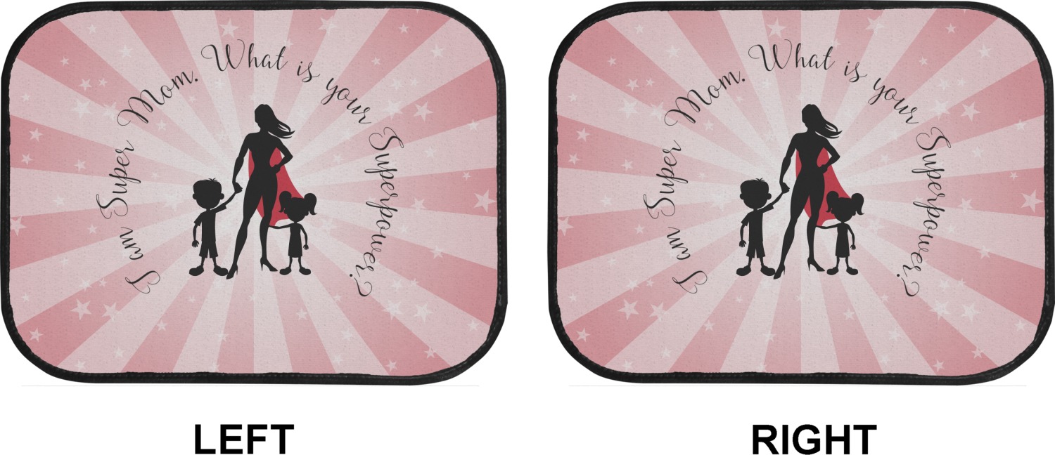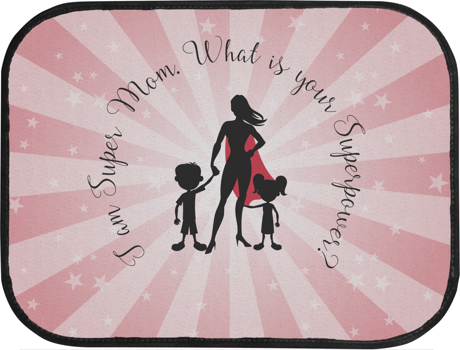 Our Super Mom design is perfect for your Mother's Day Gift. Moms today are truly super heroes with all that they have to balance. Our adorable design depicts a super hero mom / woman holding hands with a little boy and a little girl. Our super hero mom is wearing a red cape. We used a blush colored starburst with stars to highlight our beautiful mother. We personalized with our new circular text and used the words "I am a Super Mom. What is your Superpower?". We use a scripty girly font. We think the design looks outstanding!