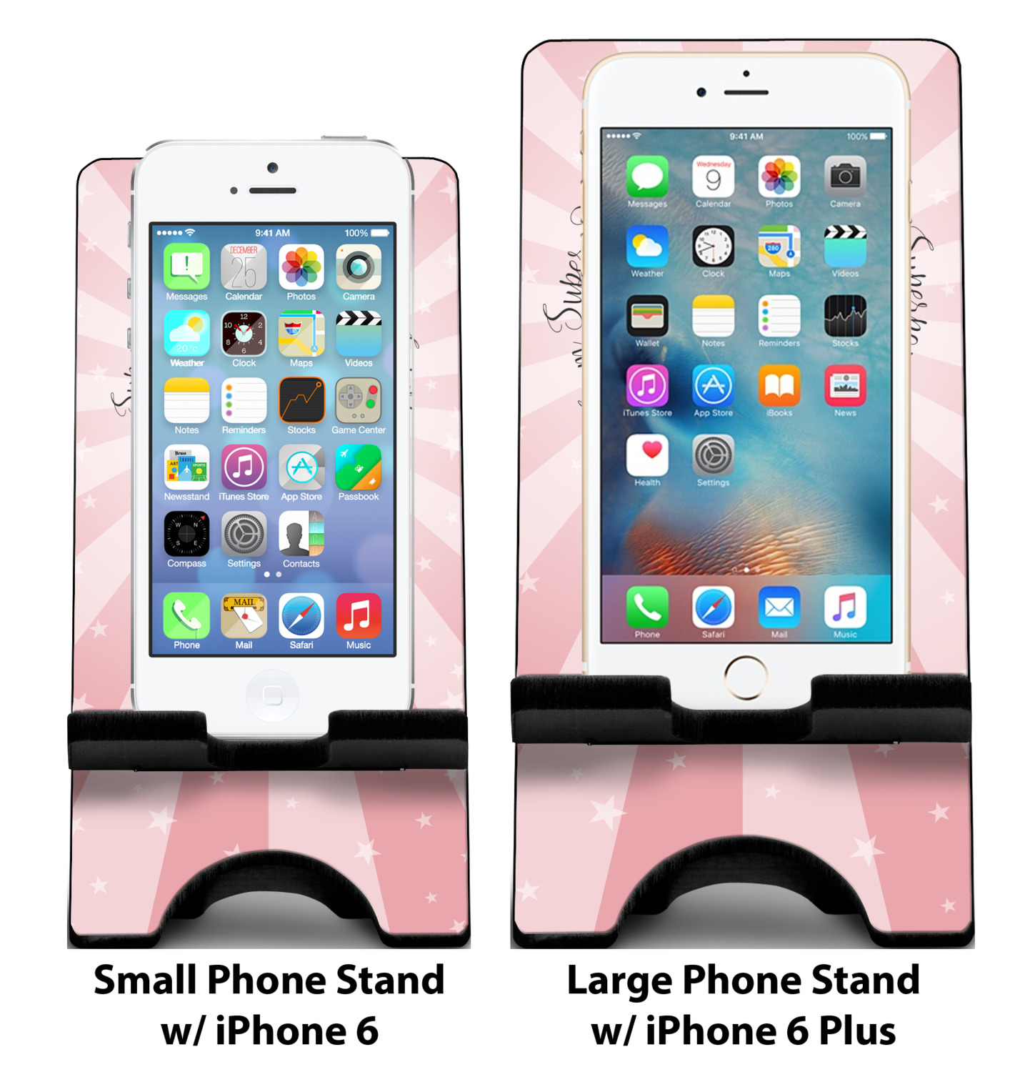 To meet your needs, we offer four variations of this IPhone stand. The backboard of the first version is shaped as a plain, yet sleek rectangle, and is available in two sizes. Our smaller size is approximately 4 by 3.25 by 7 inches, while the larger model is 4 by 3.77 by 8.5 inches. Alongside this model, we also provide you with a more decorative option. The upper part of our second version features a curved edge, for a classy, suave appearance. This phone holder is also sold in two sizes: a smaller version, which is 4 by 3.25 by 7 inches, and our larger model, which is 4 by 3.77 by 8.5 inches. Both models will support large phones, but the larger model is better if you wish to proudly display your personalized design.