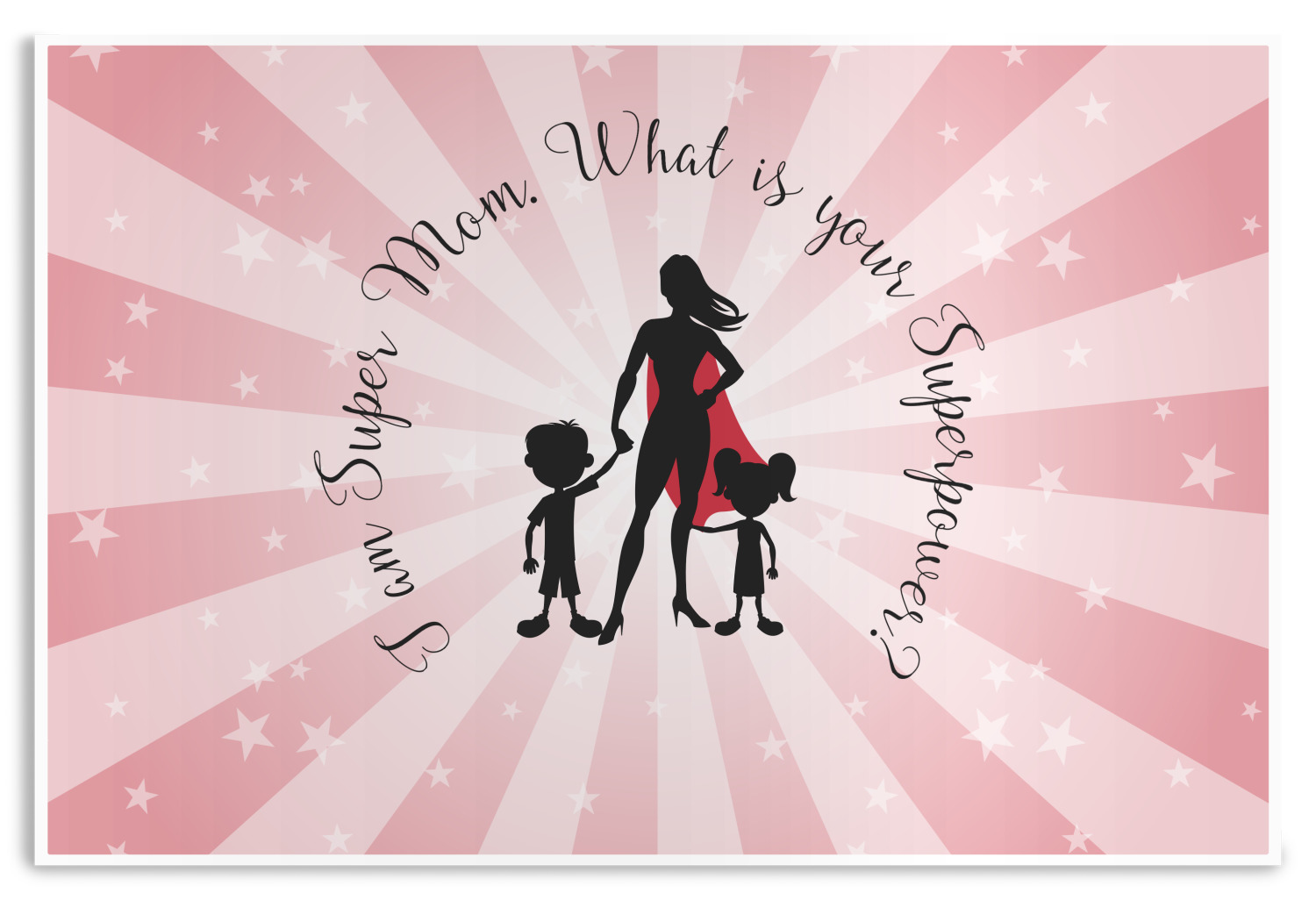 Our Super Mom design is perfect for your Mother's Day Gift. Moms today are truly super heroes with all that they have to balance. Our adorable design depicts a super hero mom / woman holding hands with a little boy and a little girl. Our super hero mom is wearing a red cape. We used a blush colored starburst with stars to highlight our beautiful mother. We personalized with our new circular text and used the words "I am a Super Mom. What is your Superpower?". We use a scripty girly font. We think the design looks outstanding!