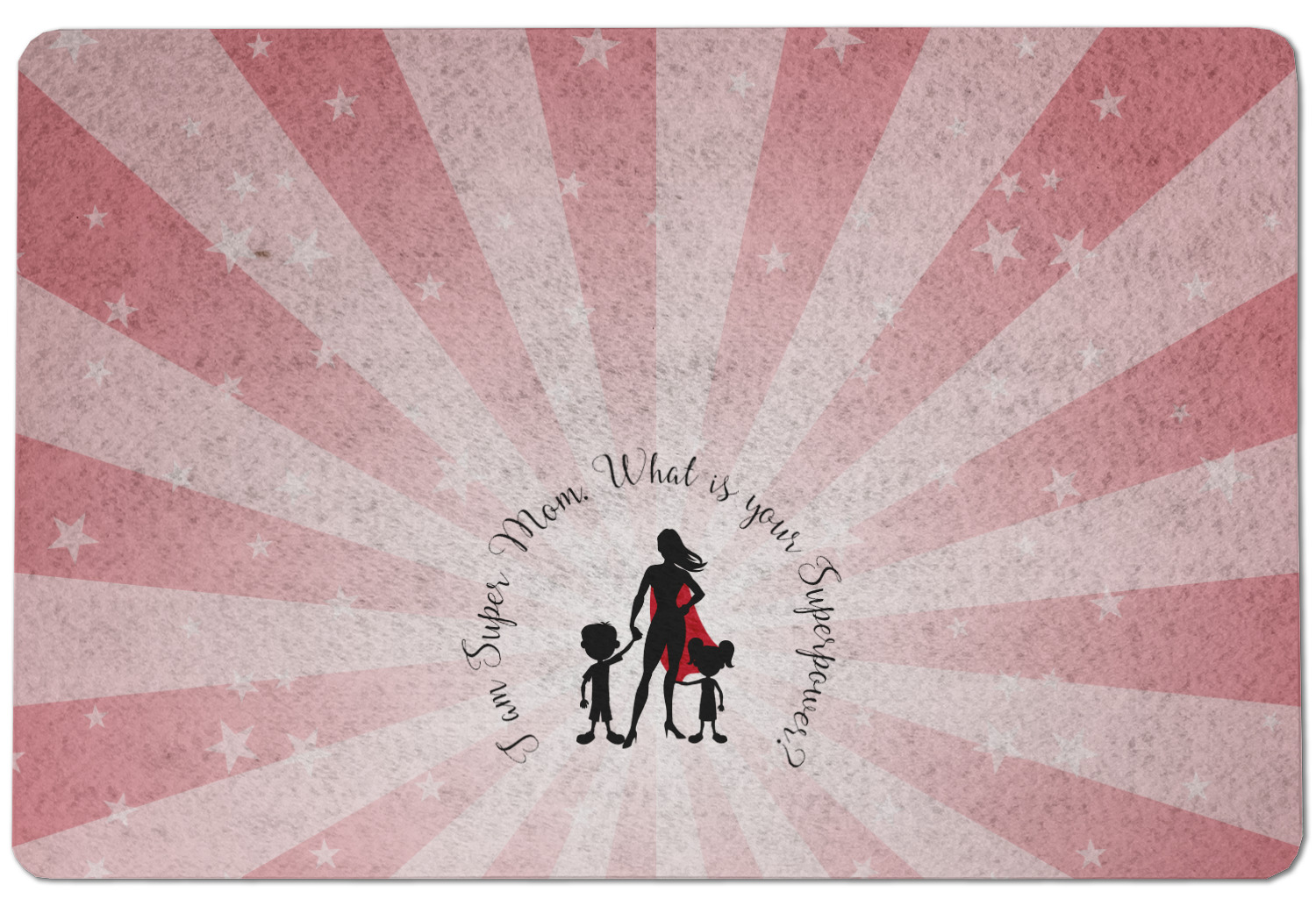 Our Super Mom design is perfect for your Mother's Day Gift. Moms today are truly super heroes with all that they have to balance. Our adorable design depicts a super hero mom / woman holding hands with a little boy and a little girl. Our super hero mom is wearing a red cape. We used a blush colored starburst with stars to highlight our beautiful mother. We personalized with our new circular text and used the words "I am a Super Mom. What is your Superpower?". We use a scripty girly font. We think the design looks outstanding!