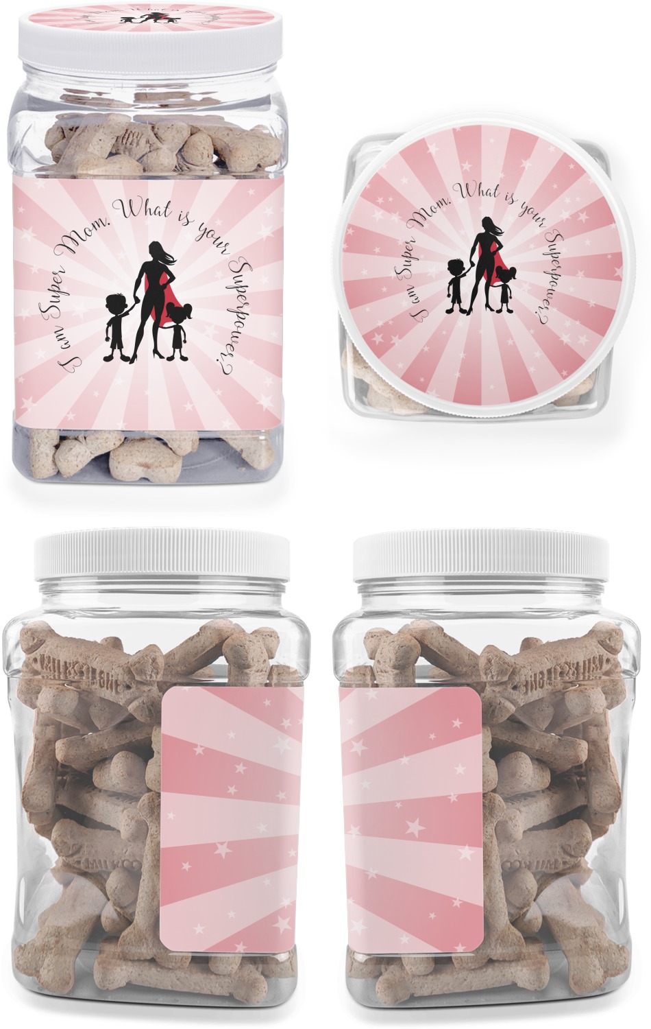 This half gallon jar, made from a sturdy plastic, is the perfect way to keep treats from any naughty pet paws, while still keeping them ready on hand for when your pup performs an impressive trick. This dog cookie jar features a screw-on, white lid that displays your personalized design on a vinyl sticker. We apply another customized sticker that wraps around the front and sides of the jar. Our dog treat jar also has indentations on the rear ends of the sides, which allows for convenient handling, and its square frame allows for easy storage.