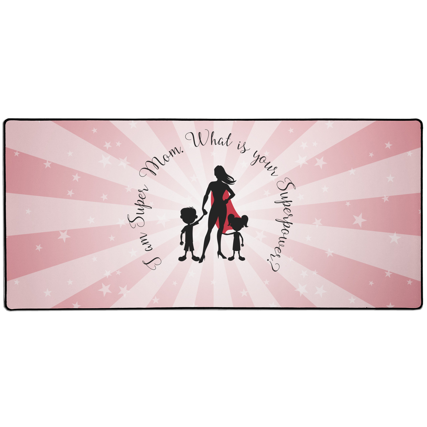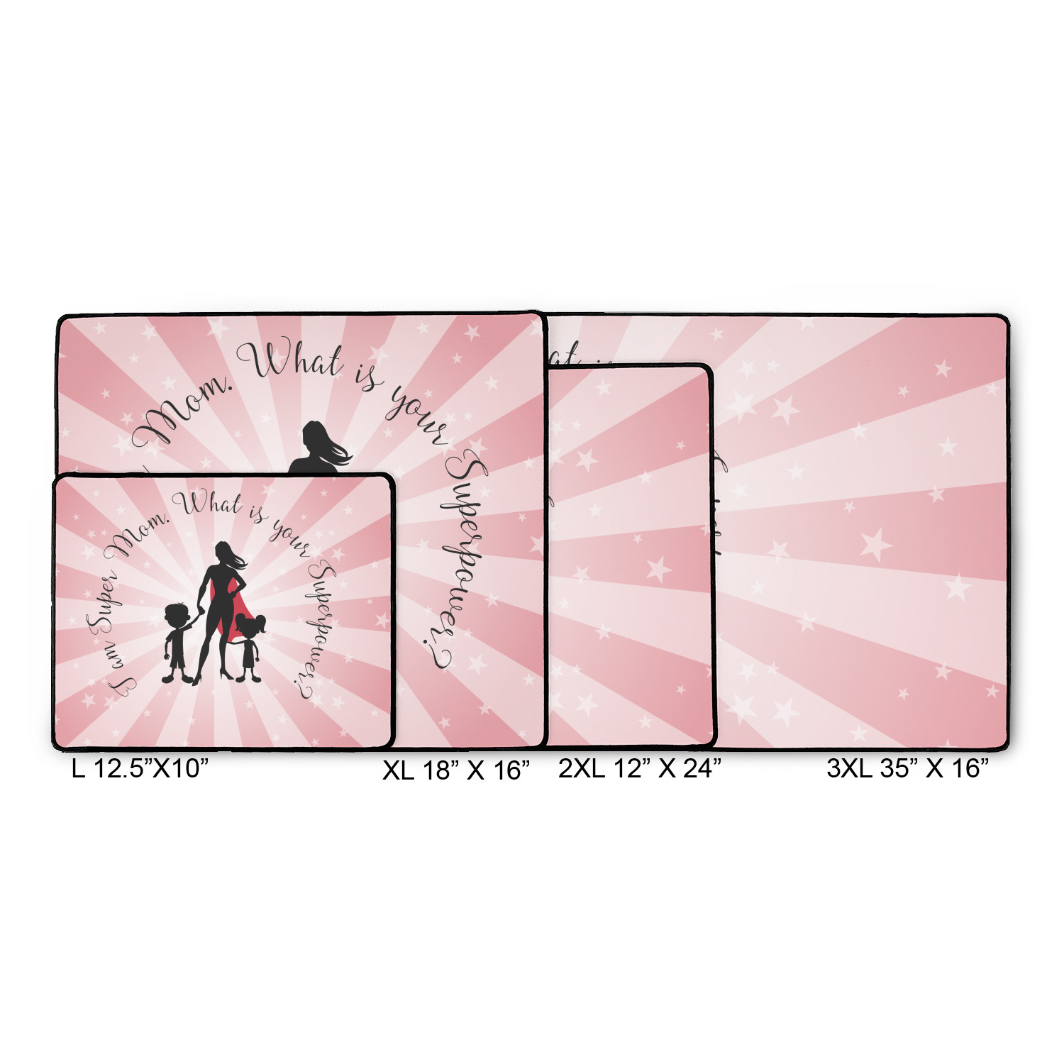 Our Super Mom design is perfect for your Mother's Day Gift. Moms today are truly super heroes with all that they have to balance. Our adorable design depicts a super hero mom / woman holding hands with a little boy and a little girl. Our super hero mom is wearing a red cape. We used a blush colored starburst with stars to highlight our beautiful mother. We personalized with our new circular text and used the words "I am a Super Mom. What is your Superpower?". We use a scripty girly font. We think the design looks outstanding!