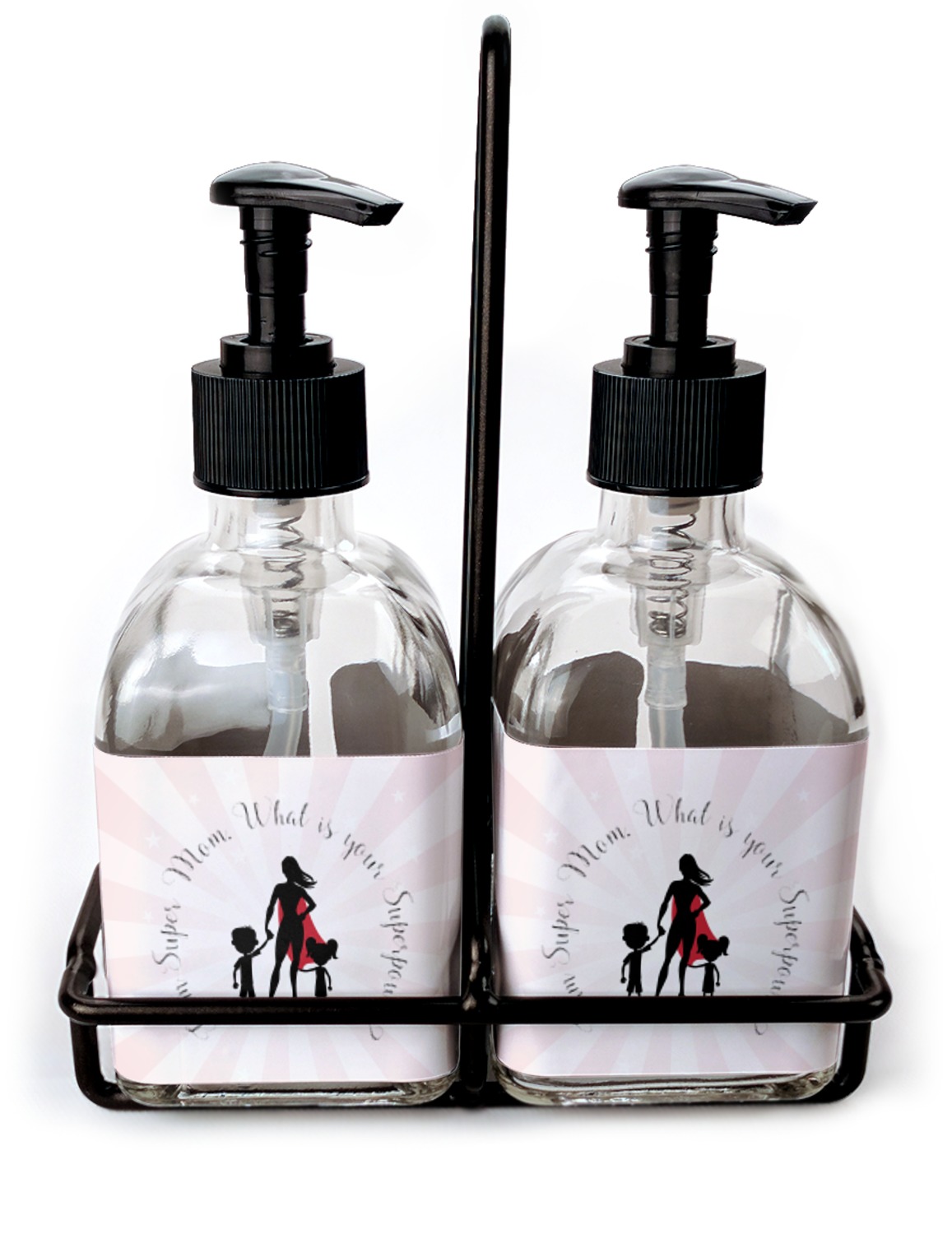 You can purchase these personalized soap dispensers as singulars, or as a set with two bottles. With your purchase of the set, we include a black frame that complements the black color of the pumps and adds to the overall classy look of the piece.