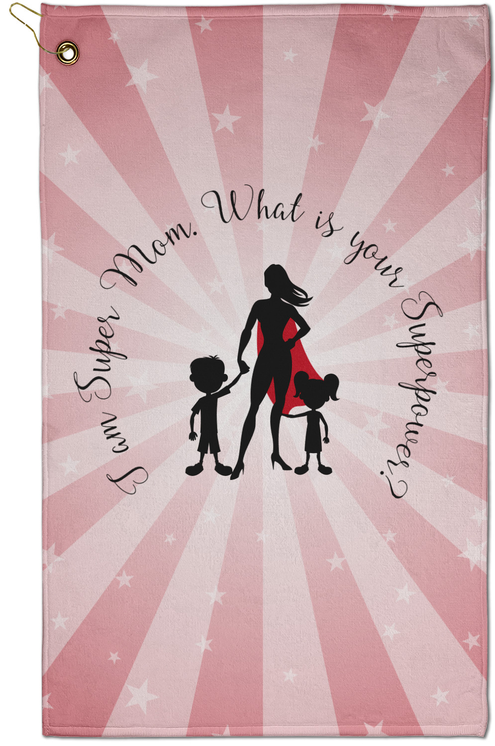 Our Super Mom design is perfect for your Mother's Day Gift. Moms today are truly super heroes with all that they have to balance. Our adorable design depicts a super hero mom / woman holding hands with a little boy and a little girl. Our super hero mom is wearing a red cape. We used a blush colored starburst with stars to highlight our beautiful mother. We personalized with our new circular text and used the words "I am a Super Mom. What is your Superpower?". We use a scripty girly font. We think the design looks outstanding!