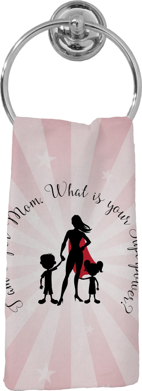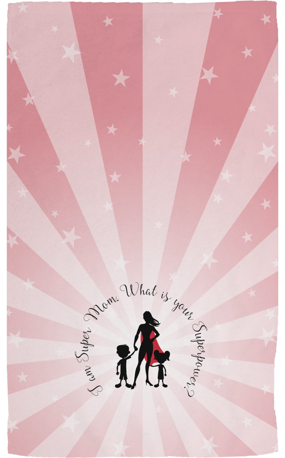 Our Super Mom design is perfect for your Mother's Day Gift. Moms today are truly super heroes with all that they have to balance. Our adorable design depicts a super hero mom / woman holding hands with a little boy and a little girl. Our super hero mom is wearing a red cape. We used a blush colored starburst with stars to highlight our beautiful mother. We personalized with our new circular text and used the words "I am a Super Mom. What is your Superpower?". We use a scripty girly font. We think the design looks outstanding!