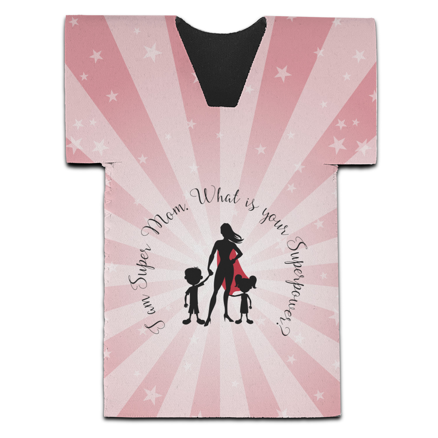 Our Super Mom design is perfect for your Mother's Day Gift. Moms today are truly super heroes with all that they have to balance. Our adorable design depicts a super hero mom / woman holding hands with a little boy and a little girl. Our super hero mom is wearing a red cape. We used a blush colored starburst with stars to highlight our beautiful mother. We personalized with our new circular text and used the words "I am a Super Mom. What is your Superpower?". We use a scripty girly font. We think the design looks outstanding!