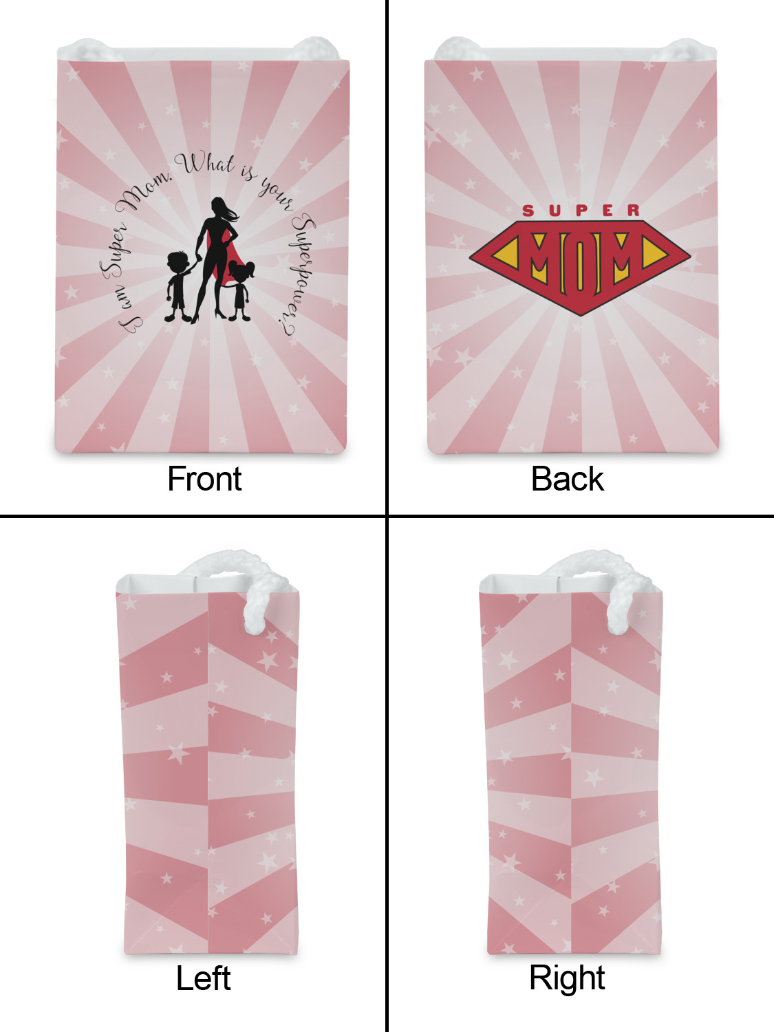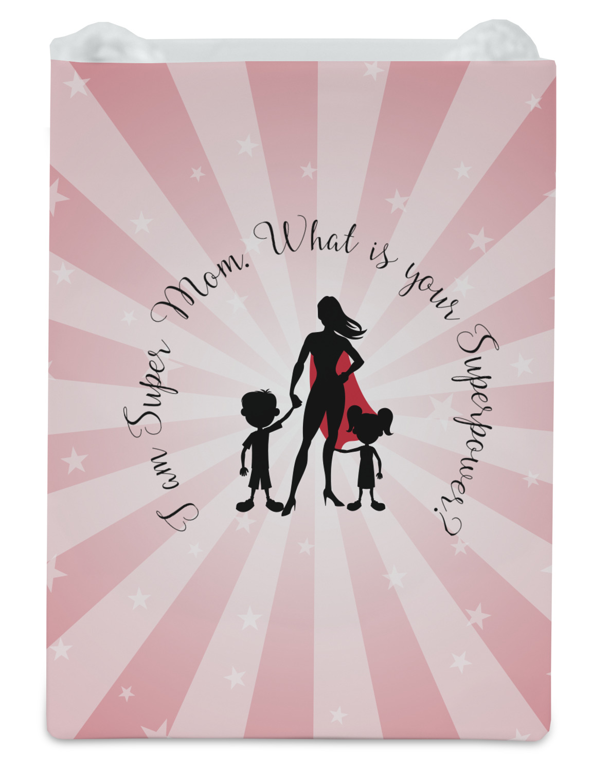 Our Super Mom design is perfect for your Mother's Day Gift. Moms today are truly super heroes with all that they have to balance. Our adorable design depicts a super hero mom / woman holding hands with a little boy and a little girl. Our super hero mom is wearing a red cape. We used a blush colored starburst with stars to highlight our beautiful mother. We personalized with our new circular text and used the words "I am a Super Mom. What is your Superpower?". We use a scripty girly font. We think the design looks outstanding!