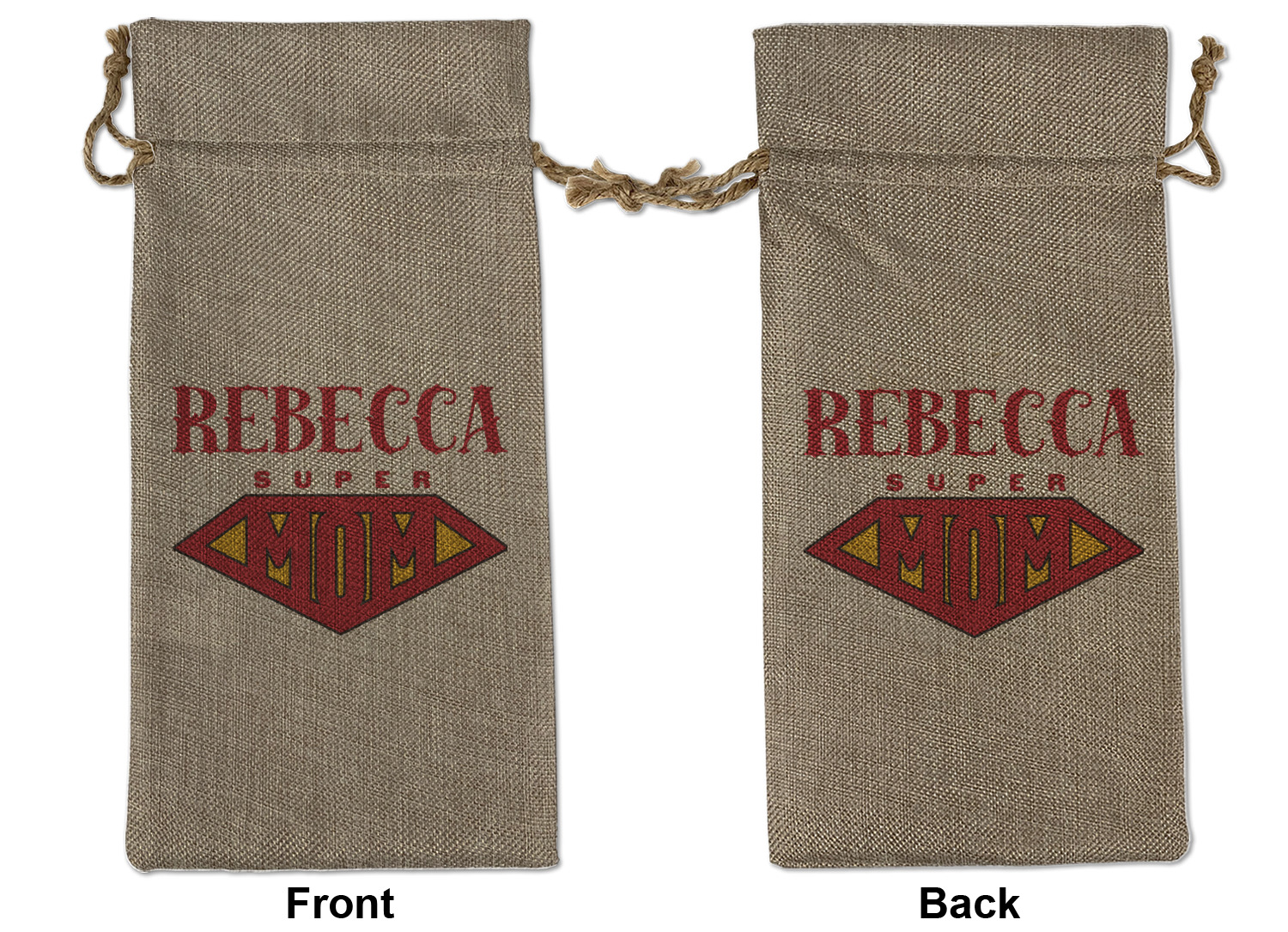 We sell our Burlap Gift Bags in 3 variant sized bags. Made with burlap polyester, each personalized bag can be secured with a twine drawstring pull. Your custom design is available to print on one side or both sides - completely up to you! The sizes of the bags measure approximately 4.5" x 6.5" for the smallest size, 6.5" x 8.0" for the medium size, and 6.5" x 13.5" for the large-sized bag.