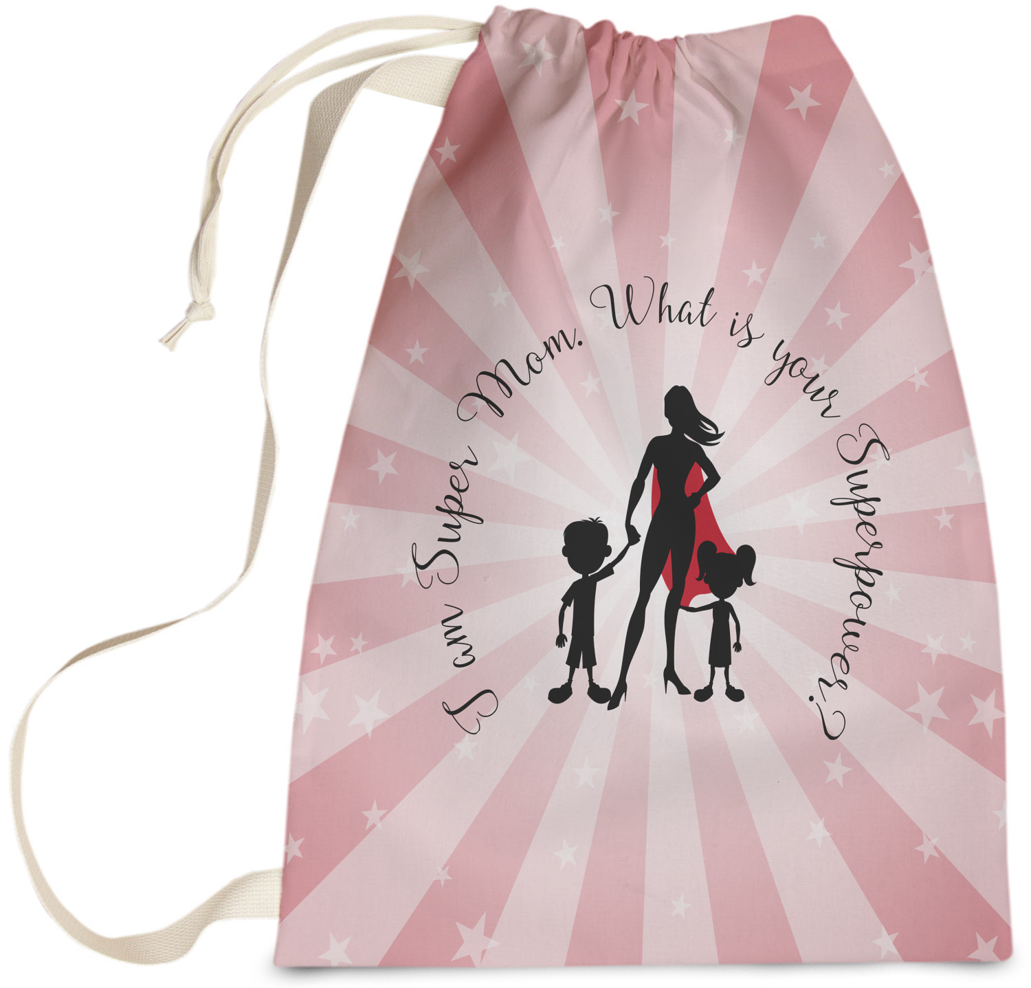 Our Super Mom design is perfect for your Mother's Day Gift. Moms today are truly super heroes with all that they have to balance. Our adorable design depicts a super hero mom / woman holding hands with a little boy and a little girl. Our super hero mom is wearing a red cape. We used a blush colored starburst with stars to highlight our beautiful mother. We personalized with our new circular text and used the words "I am a Super Mom. What is your Superpower?". We use a scripty girly font. We think the design looks outstanding!