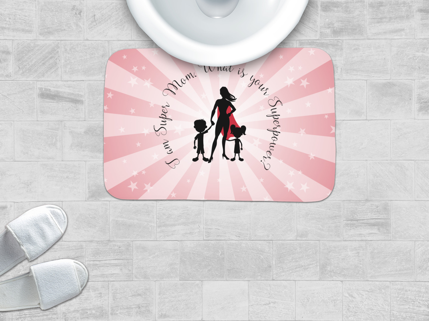 Our Super Mom design is perfect for your Mother's Day Gift. Moms today are truly super heroes with all that they have to balance. Our adorable design depicts a super hero mom / woman holding hands with a little boy and a little girl. Our super hero mom is wearing a red cape. We used a blush colored starburst with stars to highlight our beautiful mother. We personalized with our new circular text and used the words "I am a Super Mom. What is your Superpower?". We use a scripty girly font. We think the design looks outstanding!
